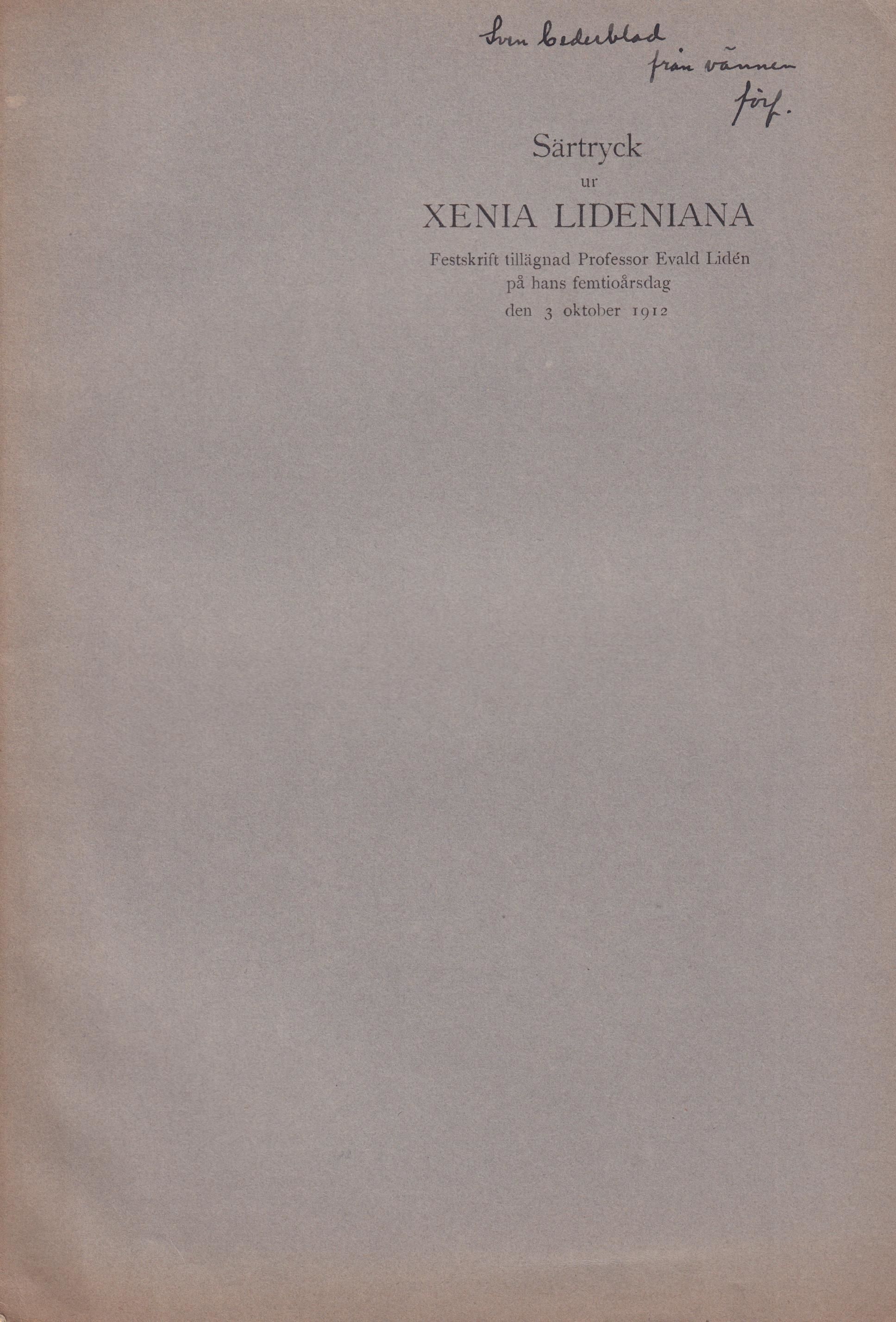 Stockholm, P.A. Norstedt & Söner, 1912. 8:o. s. [78]-83. Limhäftad med tryckt grått pappersomslag. Tillskrift ‘Sven Cederblad / från vännen förf.’ på främre omslaget. Ur Claes Westerlunds boksamling.