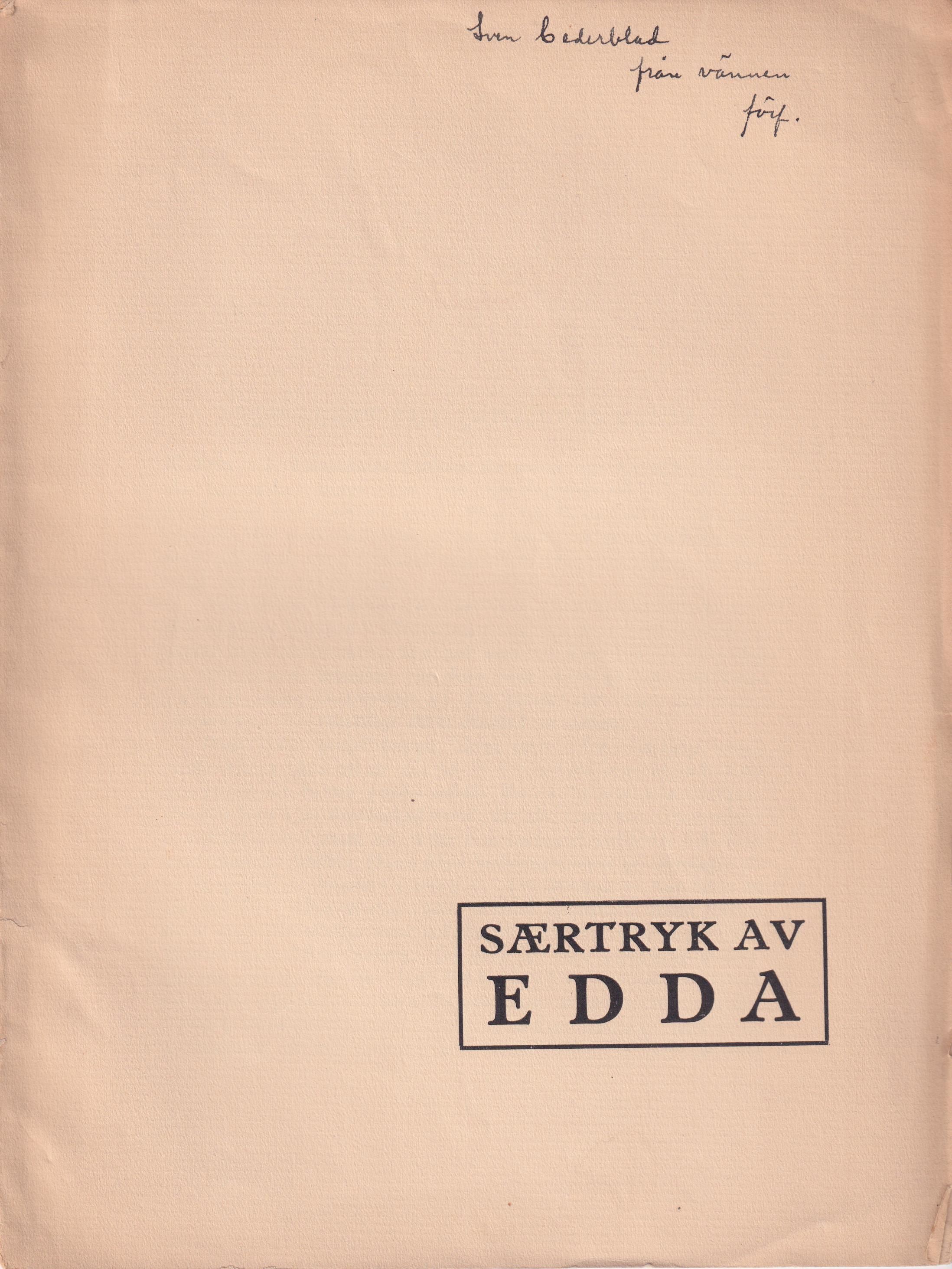 [Oslo, 1928]. 8:o. s. 215-222. Limhäftad med styvt tryckt, något nött, ljusgult pappersomslag. Främre omslag delvis loss. Sista bladet med marginalriss. Tillskrift ‘Sven Cederblad / från vännen förf.’ på främre omslaget. Ur Claes Westerlunds boksamling.