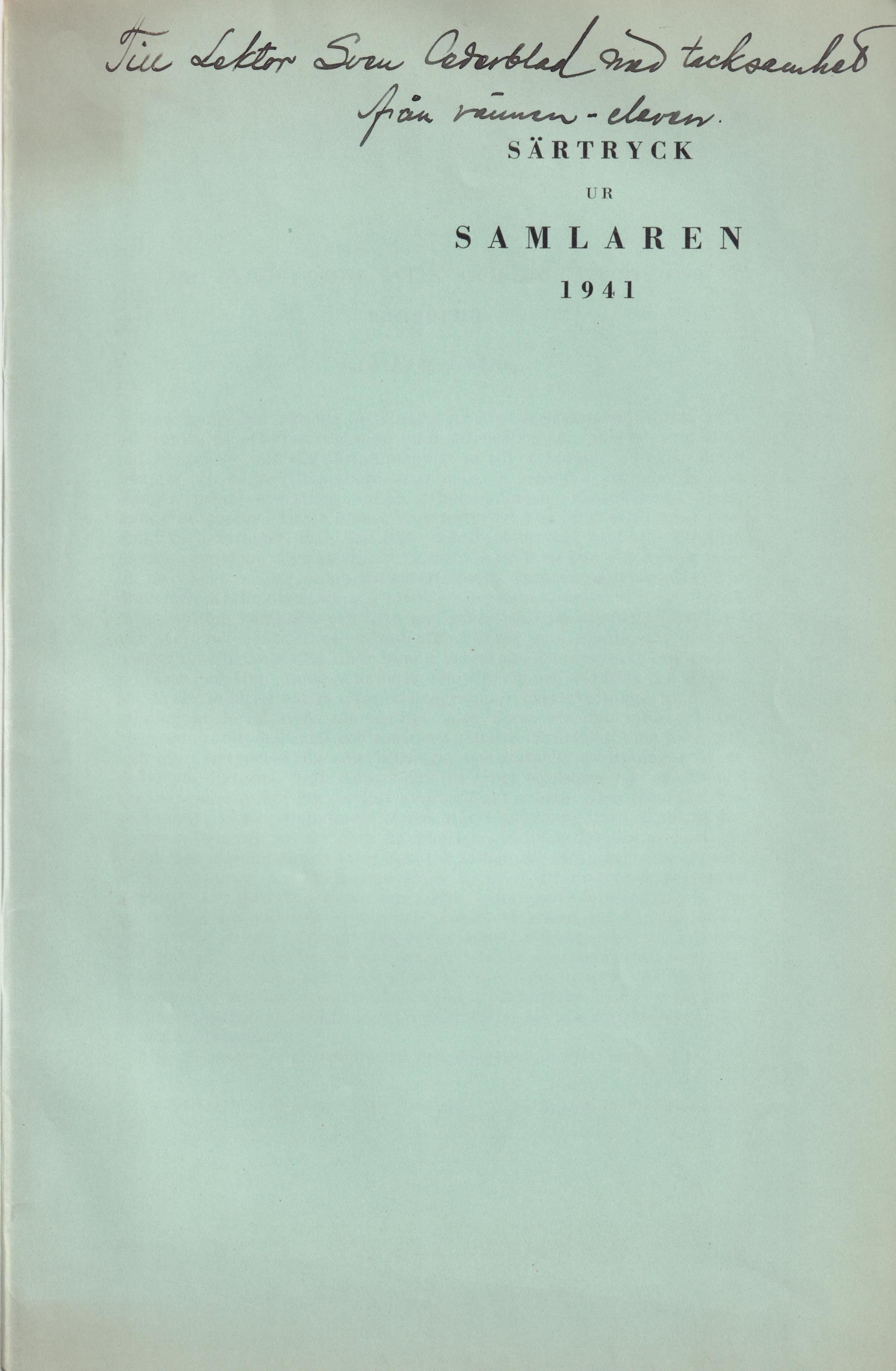 Uppsala, Almqvist & Wiksells Boktryckeri-A.-B., 1941. 8:o. s. [53]-79. Trådhäftad med tryckt ljusgrönt pappersomslag. Tillskrift ‘Till Lektor Sven Cederblad med tacksamhet / från vännen - eleven.’ på främre omslaget. Ur Claes Westerlunds boksamling.