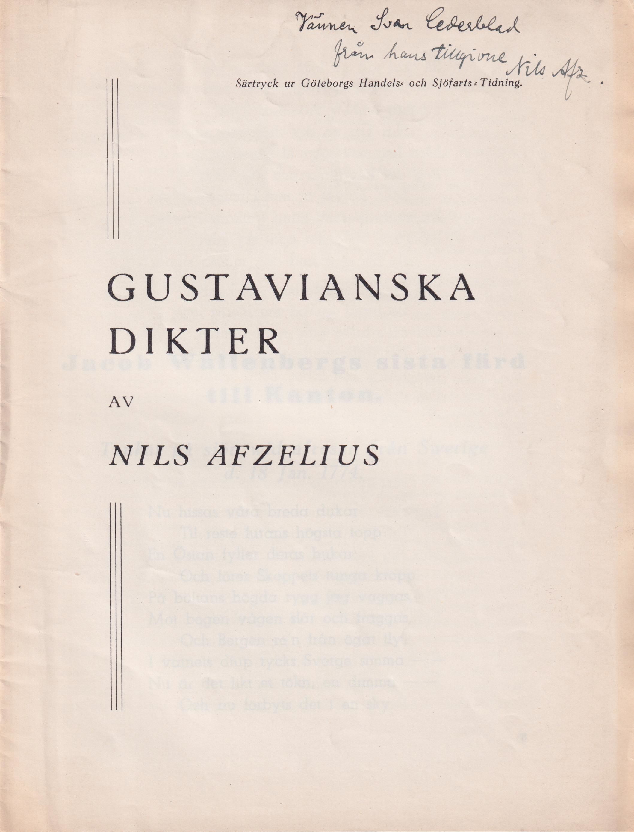 Särtryck ur ‘Göteborgs Handels- och Sjöfarts-Tidning’. Omfattar: Jacob Wallenbergs sista färd till Kanton. Tankar på sjön wid afresan från Swerige d. 18 jan. 1774; Ett ‘bannebrev’ av Anna Maria Malmstedt. Anna Maria Lenngren; En bröllopsdikt av Bellman; Eos och Narcissus. Från Thorilds informatorstid på Rånnum. Sven Cederblad (1890-1956), litteraturvetare, vars främsta insats var hans arbeten om Erik Johan Stagnelius, som avhandlingen Studier i Stagnelii romantik (1923) och biografin Stagnelius och hans omgivning (1936). Han har även skrivit om poeter som Thomas Thorild, Esaias Tegnér, Erik Sjöberg och Gustaf Fröding. Han bidrog också till Studentföreningen Verdandis småskrifter och tidskriften Samlaren.