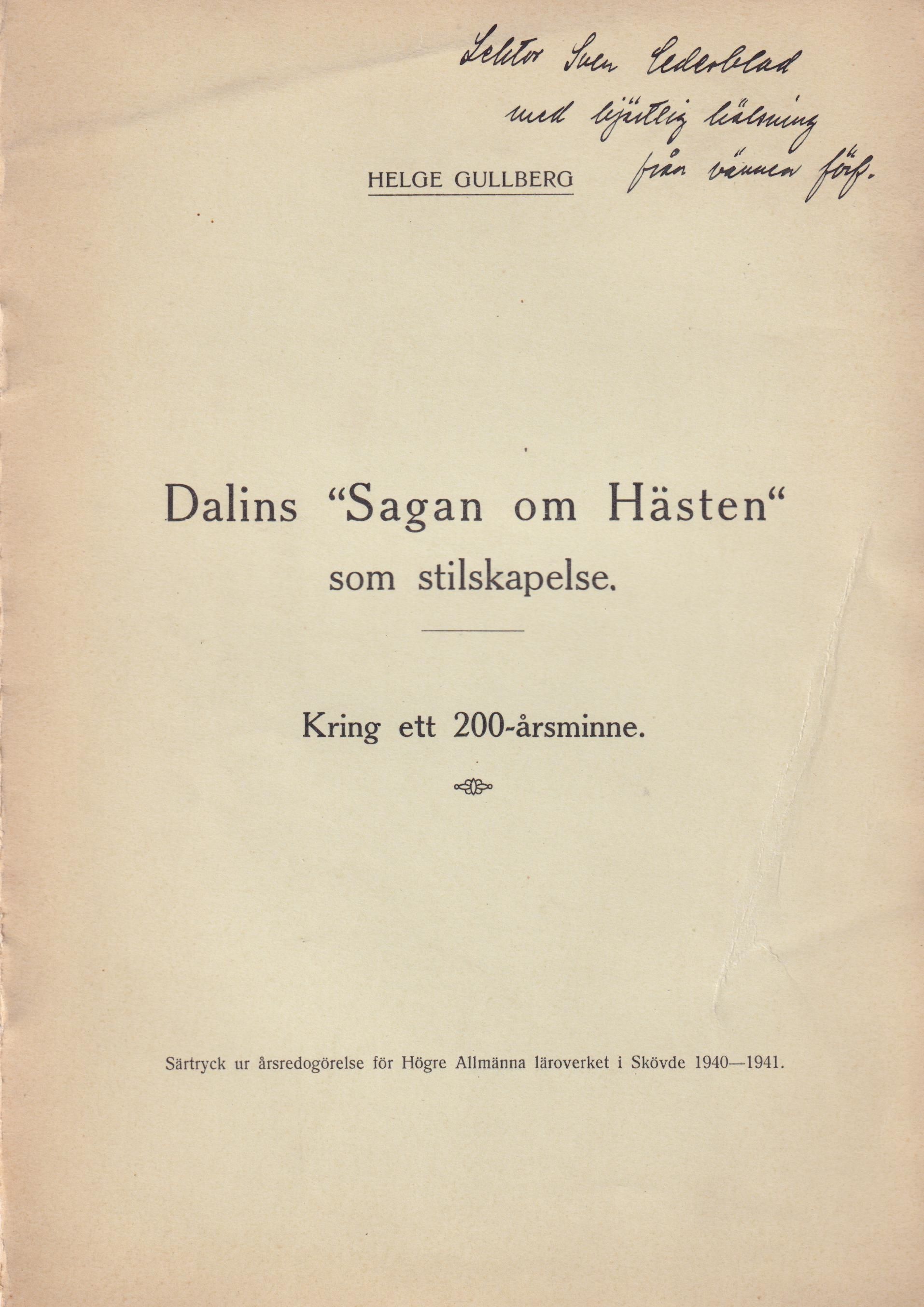 Särtryck ur ‘Årsredogörelse för Högre allmänna läroverket i Skövde 1940-1941’. Sven Cederblad (1890-1956), litteraturvetare, vars främsta insats var hans arbeten om Erik Johan Stagnelius, som avhandlingen ‘Studier i Stagnelii romantik’ (1923) och biografin ‘Stagnelius och hans omgivning’ (1936). Han har även skrivit om poeter som Thomas Thorild, Esaias Tegnér, Erik Sjöberg och Gustaf Fröding. Han bidrog också till Studentföreningen Verdandis småskrifter och tidskriften Samlaren.