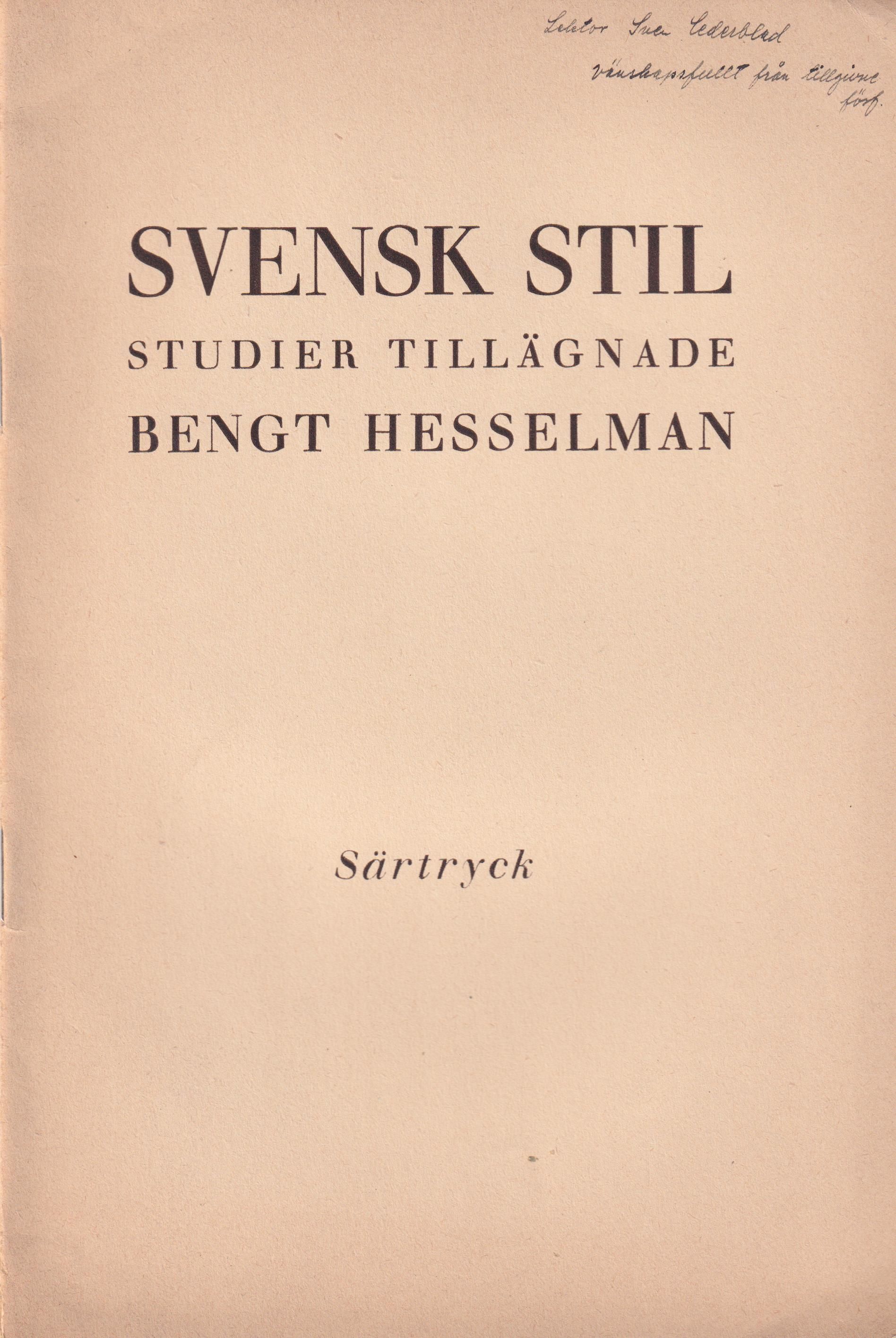 Särtryck ur ‘Svensk stil. Studier tillägnade Bengt Hesselman’. Sven Cederblad (1890-1956), litteraturvetare, vars främsta insats var hans arbeten om Erik Johan Stagnelius, som avhandlingen ‘Studier i Stagnelii romantik’ (1923) och biografin ‘Stagnelius och hans omgivning’ (1936). Han har även skrivit om poeter som Thomas Thorild, Esaias Tegnér, Erik Sjöberg och Gustaf Fröding. Han bidrog också till Studentföreningen Verdandis småskrifter och tidskriften Samlaren.