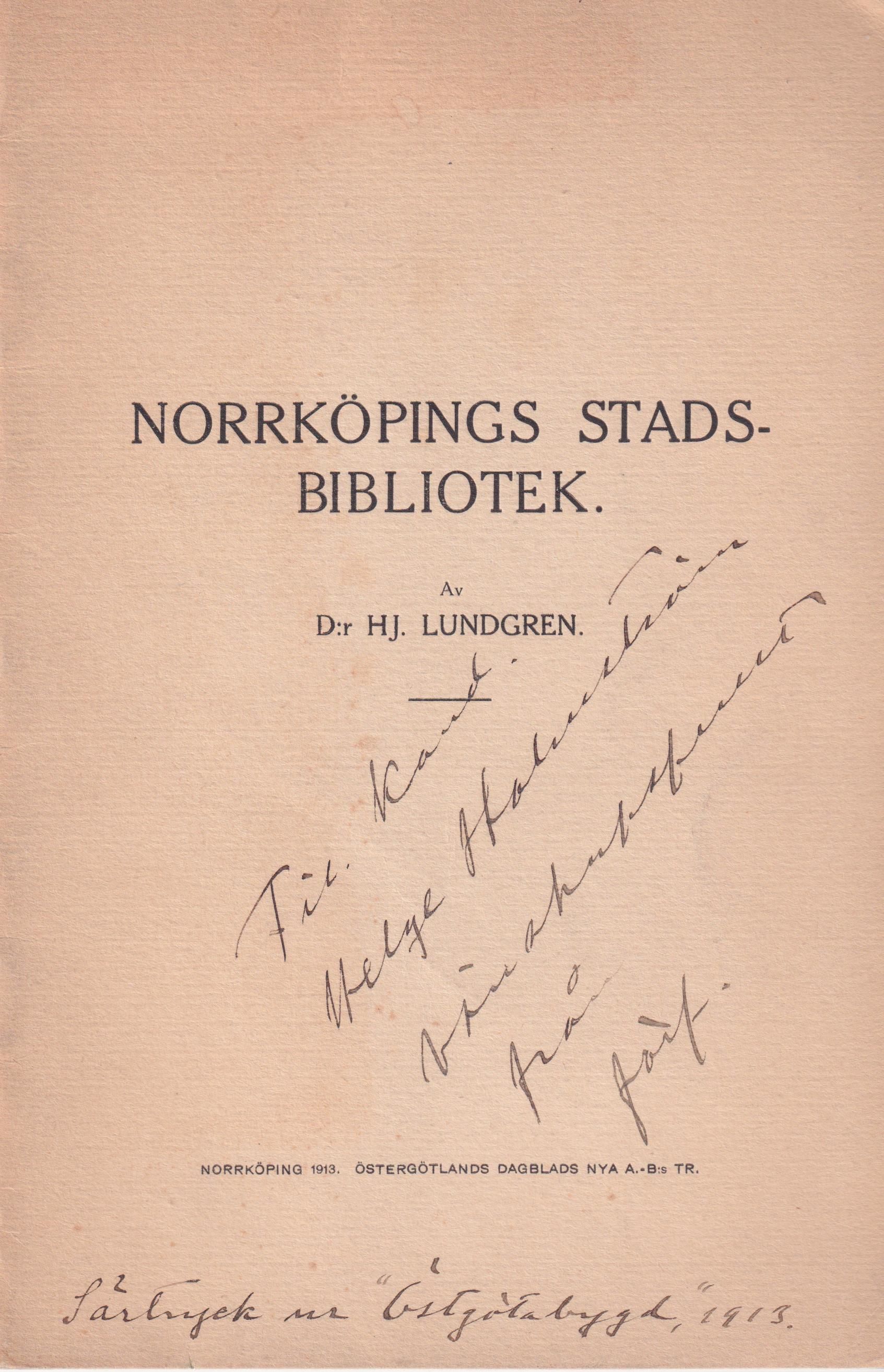 Norrköping, Östergötlands Dagblads Nya A.-B. Tr., 1913. 8:o. (8) s. Illustrerad. Klammerhäftad med styvt tryckt pappersomslag. Tillskrift ‘Fil. Kand. / Helge Holmström / vänskapsfullt från förf.’ på främre omslag. Ur Folke Holmströms bibliotek.