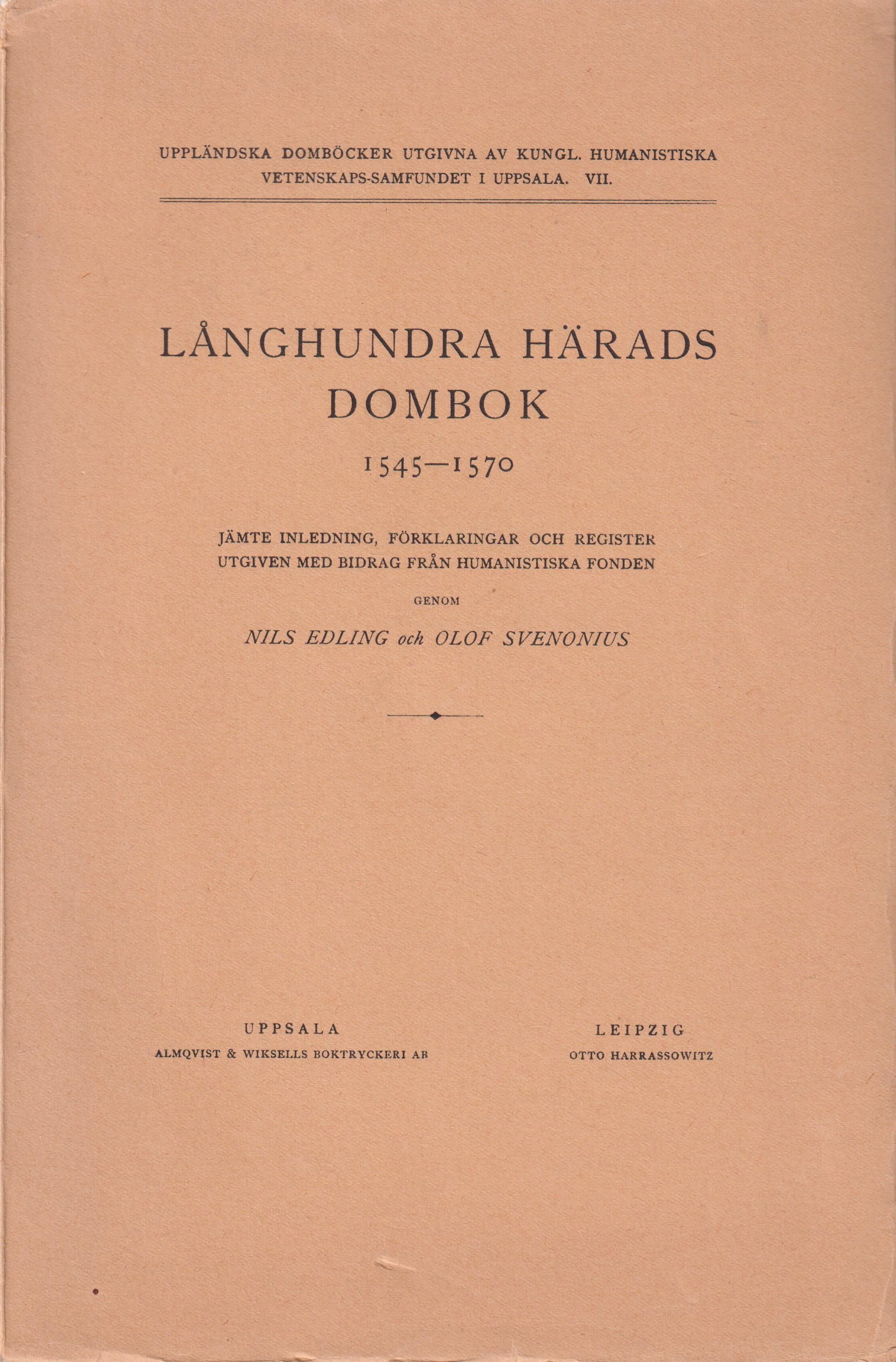 Långhundra härads dombok 1545-1570 jämte inledning, förklaringar och register utgiven med bidrag från humanistiska fonden genom Nils Edling och Olof Svenonius.