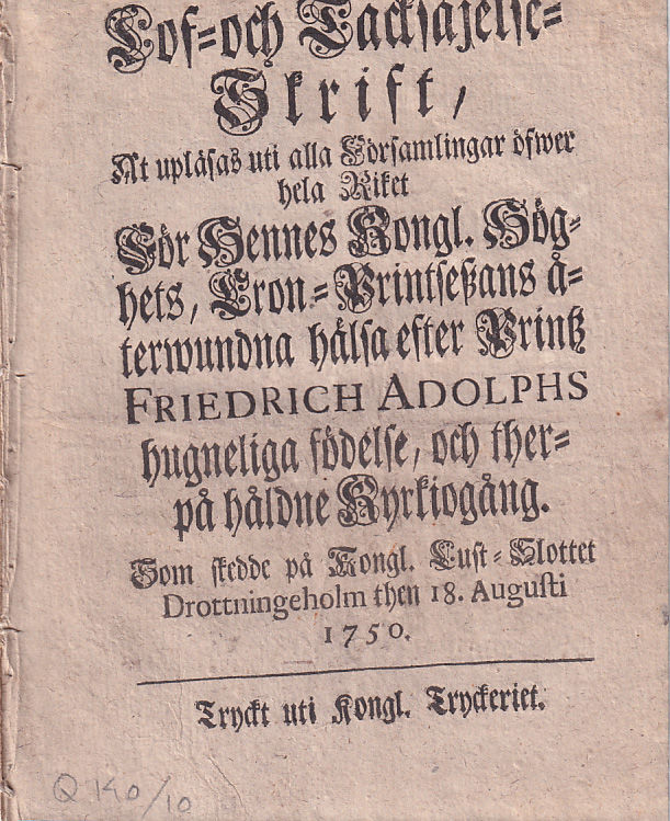 Lof- och Tacksäjelse-Skrift, At upläsas uti alla Församlingar öfwer hela Riket För Hennes Kongl. Höghets, Cron-Printseszans återwundna hälsa efter Printz Friedrich Adolphs hugneliga födelse, och therpå håldne Kyrkiogång, Som skedde på Kongl. Lust-Slottet Drottningeholm then 18. Augusti 1750.