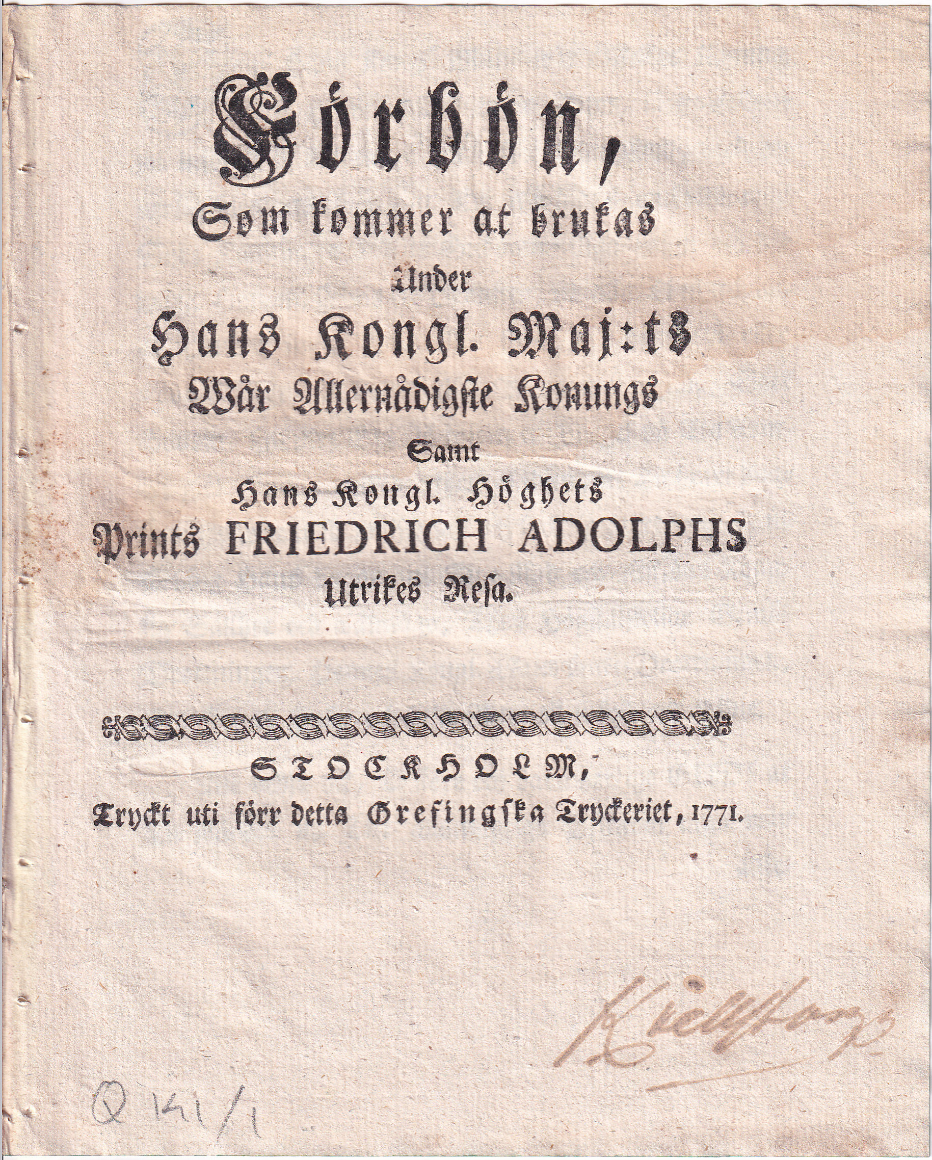 Stockholm, tryckt uti förr detta Grefingska tryckeriet, 1771. 4:o. (4) s. Tagen ur band.