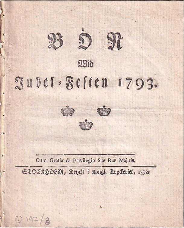 Stockholm, tryckt i kongl. tryckeriet, 1792. 4:o. (4) s. Titelbladet med träsnittsvinjett. Tagen ur band.