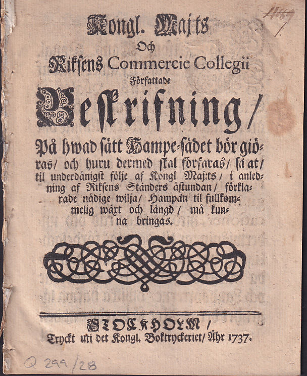 Kongl. maj:ts och riksens commercie collegii författade beskrifning, på hwad sätt hampe-sädet bör giöras, och huru dermed skal förfaras, så at, til underdånigst följe af kongl. maj:ts, i anledning af riksens ständers åstundan, förklarade nådige wilja, hampan til fullkommelig wäxt och längd, må kunna bringas.