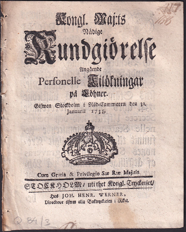 Kongl. maj:ts nådige Kundgiörelse Angående Personelle Tilökningar på Löhner. Gifwen Stockholm i Råd-cammaren den 31. januarii 1735.