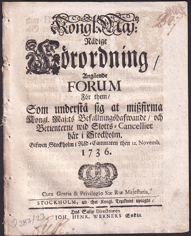 Kongl: maj:tz nådige Förordning, Angående Forum För them, Som understå sig at miszfirma Kongl. Maj:ts Befallningshafwande, och Betienterne wid Slotts-Cancelliet här i Stockholm. Gifwen Stockholm i Råd-Cammaren then 12. novemb. 1736.