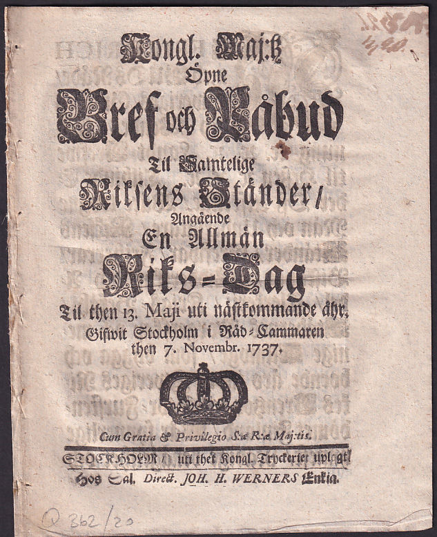 Kongl. Maj:tz Öpne Bref och Påbud Til Samtelige Riksens Ständer, Angående En Allmän Riks-Dag Til then 13. Maji uti nästkommande åhr. Gifwit Stockholm i Råd-Cammaren then 7. Novembr. 1737.