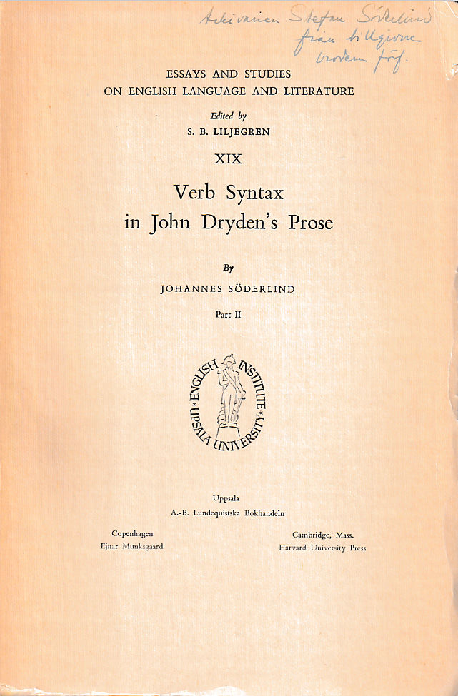 Göteborg, Elanders Boktryckeri Aktiebolag, 1958. 8:o. xvij, 243 s. Trådhäftad med styvt tryckt ljusgult pappersomslag. Tillskrift ‘Arkivarien Stefan Söderlind / från tillgivne brodern förf.’ på främre omslaget.