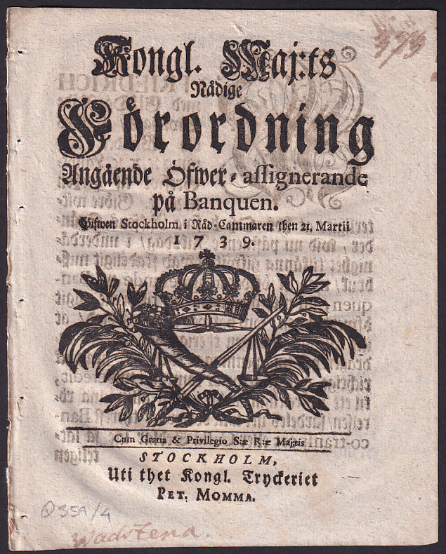 Kongl. Maj:ts Nådige Förordning, Angående Öfwer-assignerande på Banquen. Gifwen Stockholm i Råd-Cammaren then 21. Martii 1739.