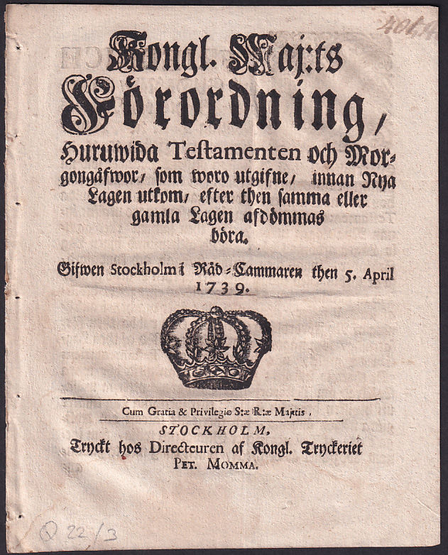 Kongl. Maj:ts Förordning, Huruwida Testamenten och Morgongåfwor, som woro utgifne, innan Nya Lagen utkom, efter then samma eller gamla Lagen afdömmas böra. Gifwen Stockholm i Råd-Cammaren then 5. April 1739.