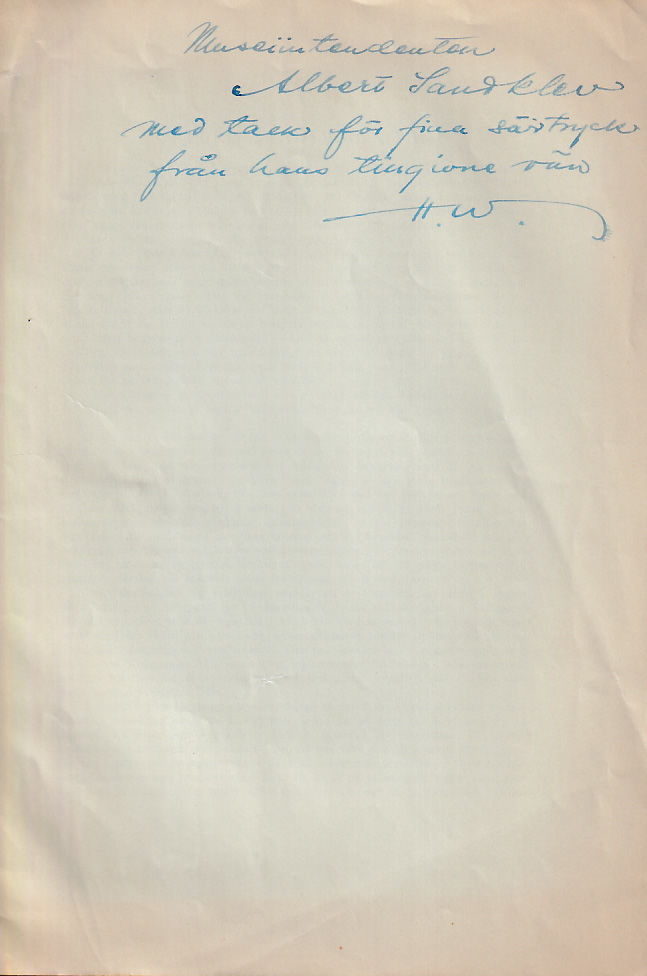 Örebro, A.-B. Littorin Rydén Boktr., 1940. 8:o. s. [101]-105, (1) s. Illustrerad. Limhäftad med anonymt ljusgrönt pappersomslag. Tillskrift ‘Museiintendenten Albert Sandklef / med tack för fina särtryck från hans tillgivne vän H.W.’ på främre omslag.