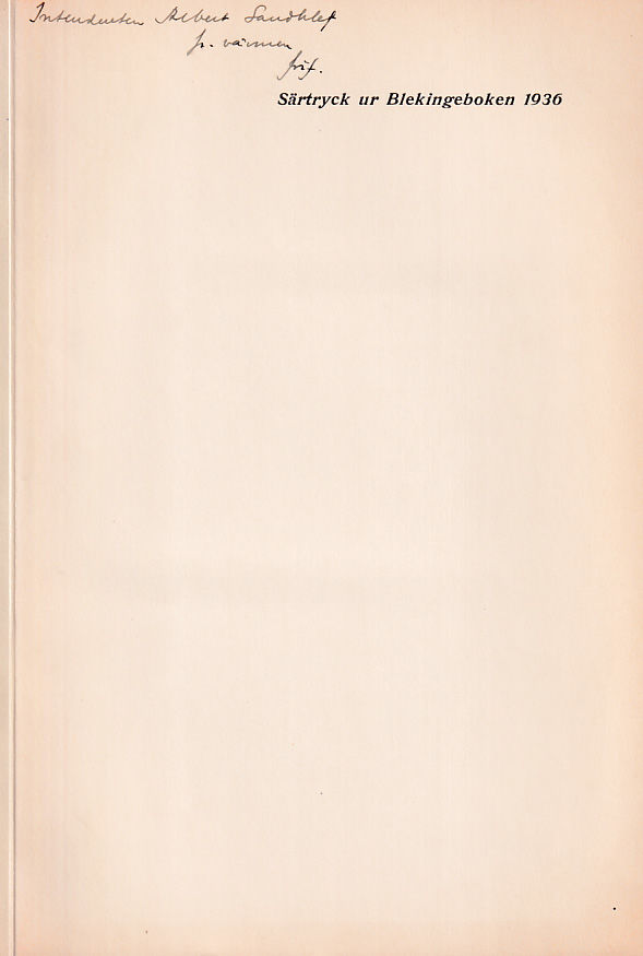 Karlskrona, K.L. Svenssons Eftr:s Bokindustri-Aktiebolag, 1936. 8:o. 41 s. Illustrerad. Klammerhäftad med styvt tryckt ljusgult pappersomslag. Tillskrift ‘Intendenten Albert Sandklef / fr. vännen förf.’ på främre omslag.