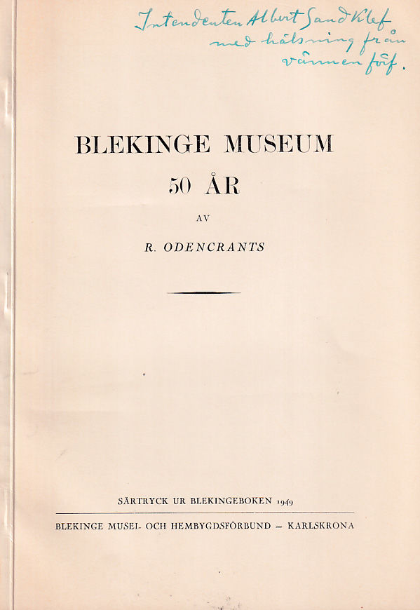 Karlskrona, K.L. Svenssons Eftr:s Bokindustri-Aktiebolag, 1949. 8:o. 22 s. Illustrerad. Klammerhäftad med styvt tryckt ljusgult pappersomslag. Tillskrift ‘Intendenten Albert Sandklef / med hälsning från vännen förf.’ på främre omslag.