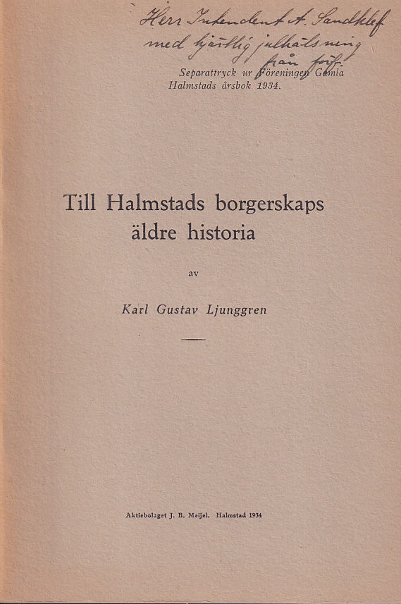 Halmstad, Aktiebolaget J.B. Meijel, 1934. 8:o. s. [139]-182. Klammerhäftad med styvt tryckt grått pappersomslag. Välhållet exemplar. Tillskrift ‘Herr Intendenten A. Sandklef / med hjärtlig julhälsning / från förf.’ på främre omslag.
