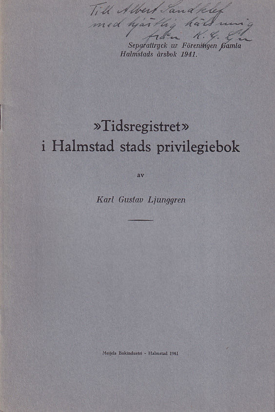 Halmstad, Meijels Bokindustri, 1941. 8:o. s. [56]-69. Klammerhäftad med styvt tryckt grått pappersomslag. Välhållet exemplar. Tillskrift ‘Till Albert Sandklef / med hjärtlig hälsning / från K.G. Ljn’ på främre omslag.