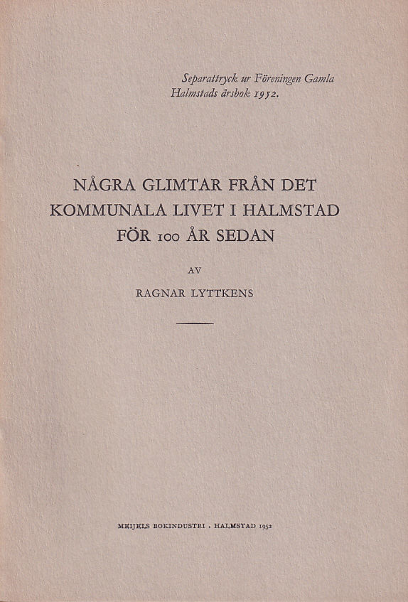 Halmstad, Meijels Bokindustri, 1952. 8:o. s. [80]-93. Sparsamt illustrerad. Klammerhäftad med styvt tryckt grått pappersomslag. Tillskrift ‘Henning Wieslander / från tillgivne Ragnar Lyttkens’.