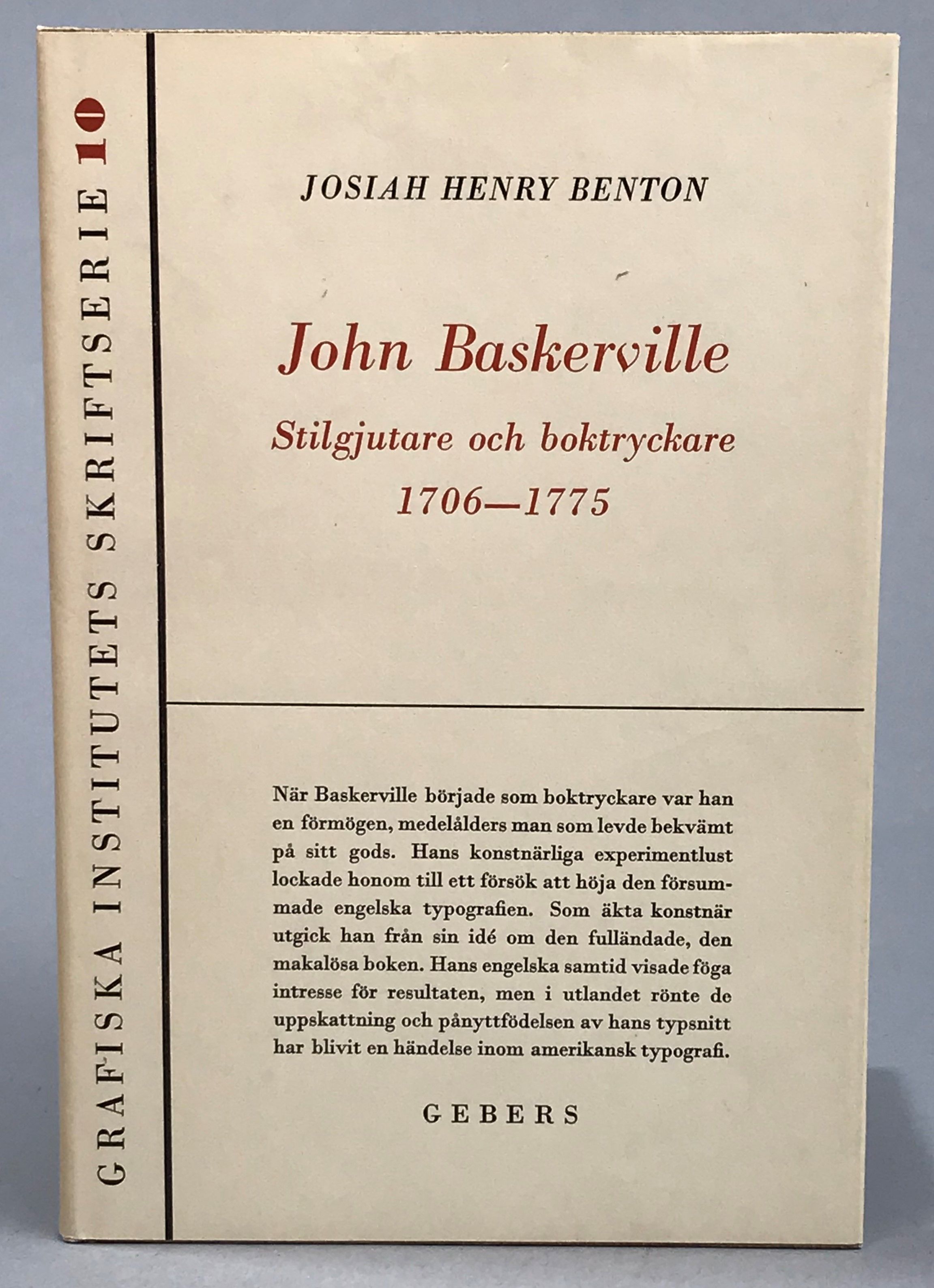 Grafiska Institutets Skriftserie 10. Originalets titel ‘John Baskerville, Type-Founder and Printer 1706-1775’. Innehåll: Inledning; John Baskerville; Anmärkningar; Bihang.