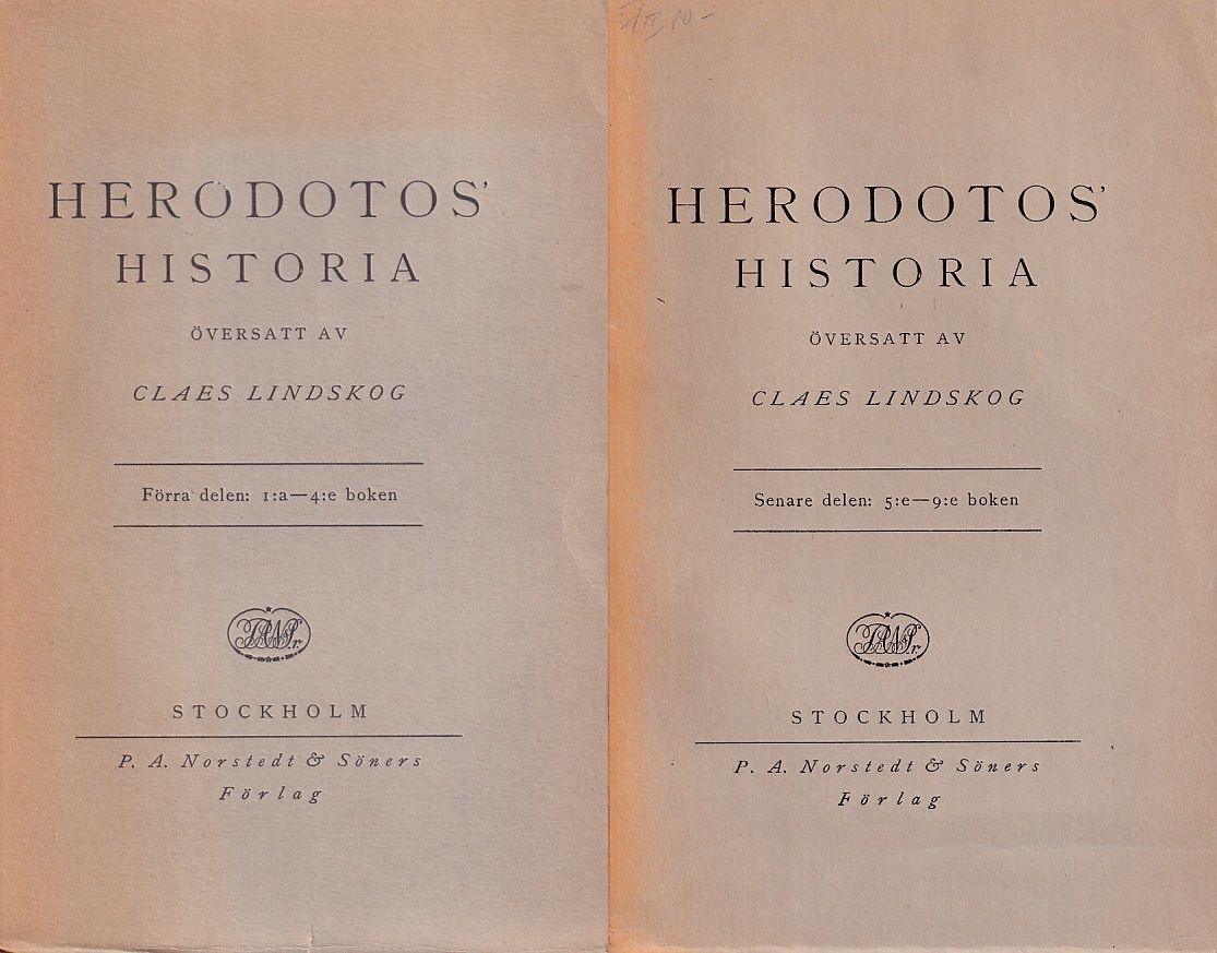 Herodotos' historia. Översatt av Claes Lindskog. Förra delen: 1:a-4:e boken. [... Senare delen: 5:e-9:e boken]. [Utg. av] P.A. Norstedt & Söners Förlag.