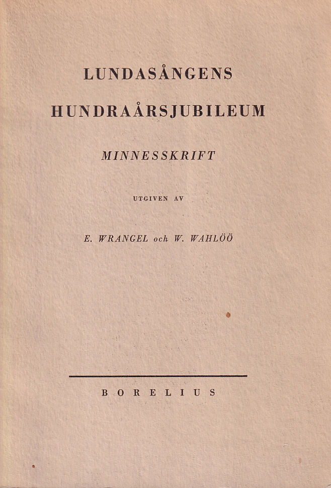 Lundasångens hundraårsjubileum. Minnesskrift på uppdrag av Lunds studentsångförening utgiven av E. Wrangel och W. Wahlöö.