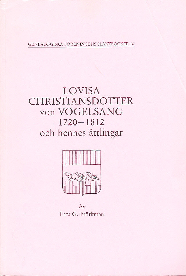 Genealogiska föreningens släktböcker 16.Rättelse och tilläggsblad inklistrat på s. 182. Innehåll: Inledning; Det Vogelsangska fideikommisset; Något om ätten von Vogelsang; Lovisa Christiansdotters ättlingar; Vogelsangska släktstiftelsen; Förkortningar; Litteratur och källförteckning; Personförteckning; Rättelser och tillägg.