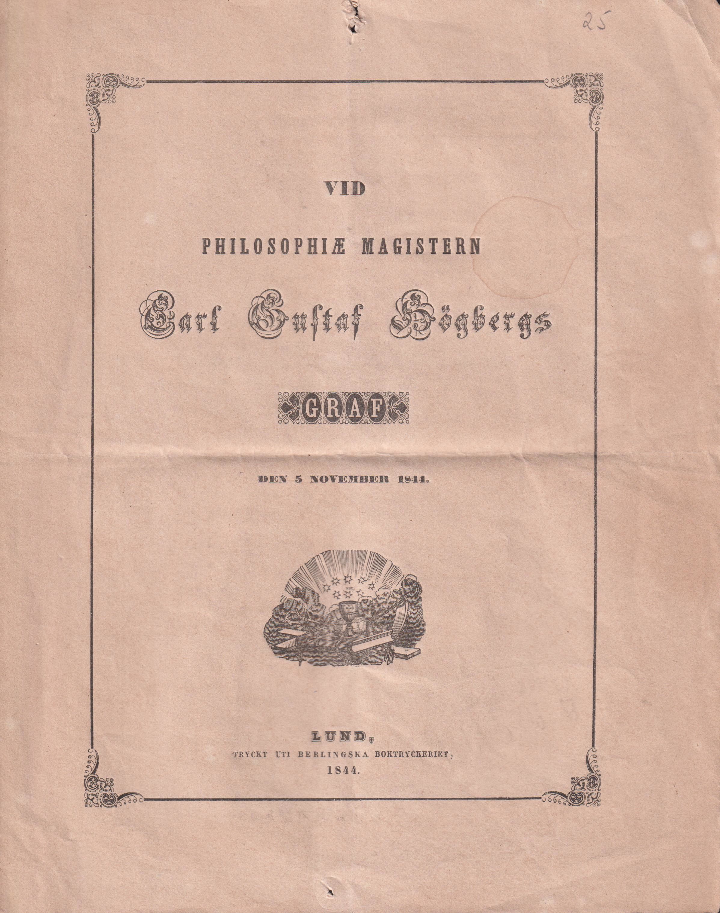 Vid philosophiæ magistern Carl Gustaf Högbergs graf den 5 november 1844.