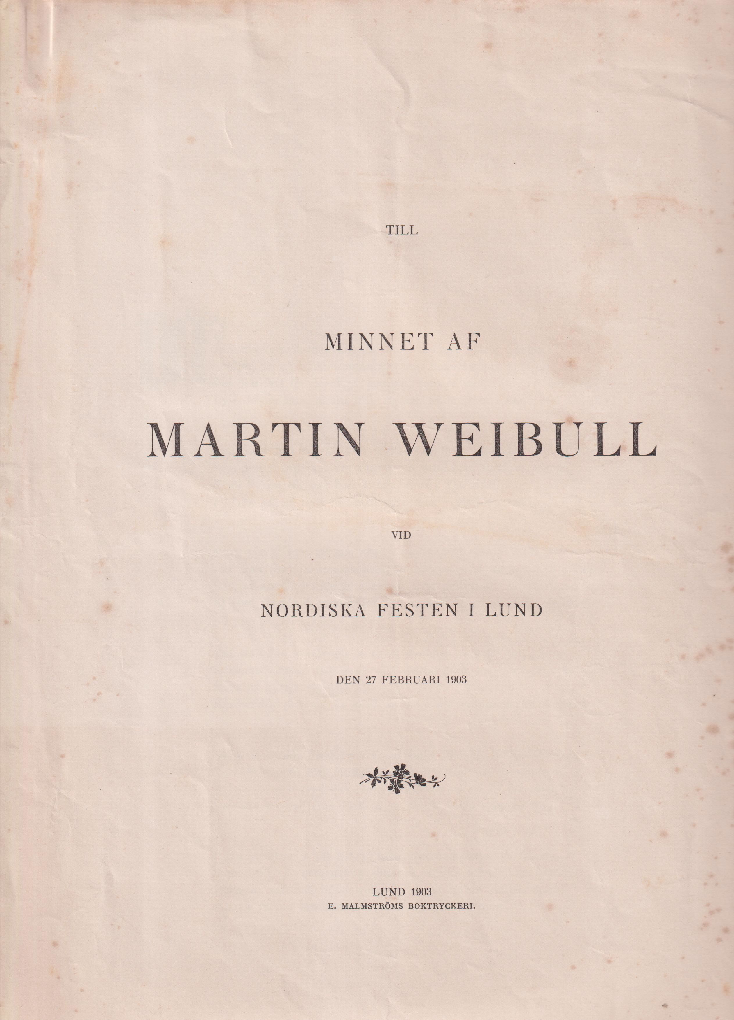 Till minnet af Martin Weibull vid nordiska festen i Lund den 27 februari 1903.