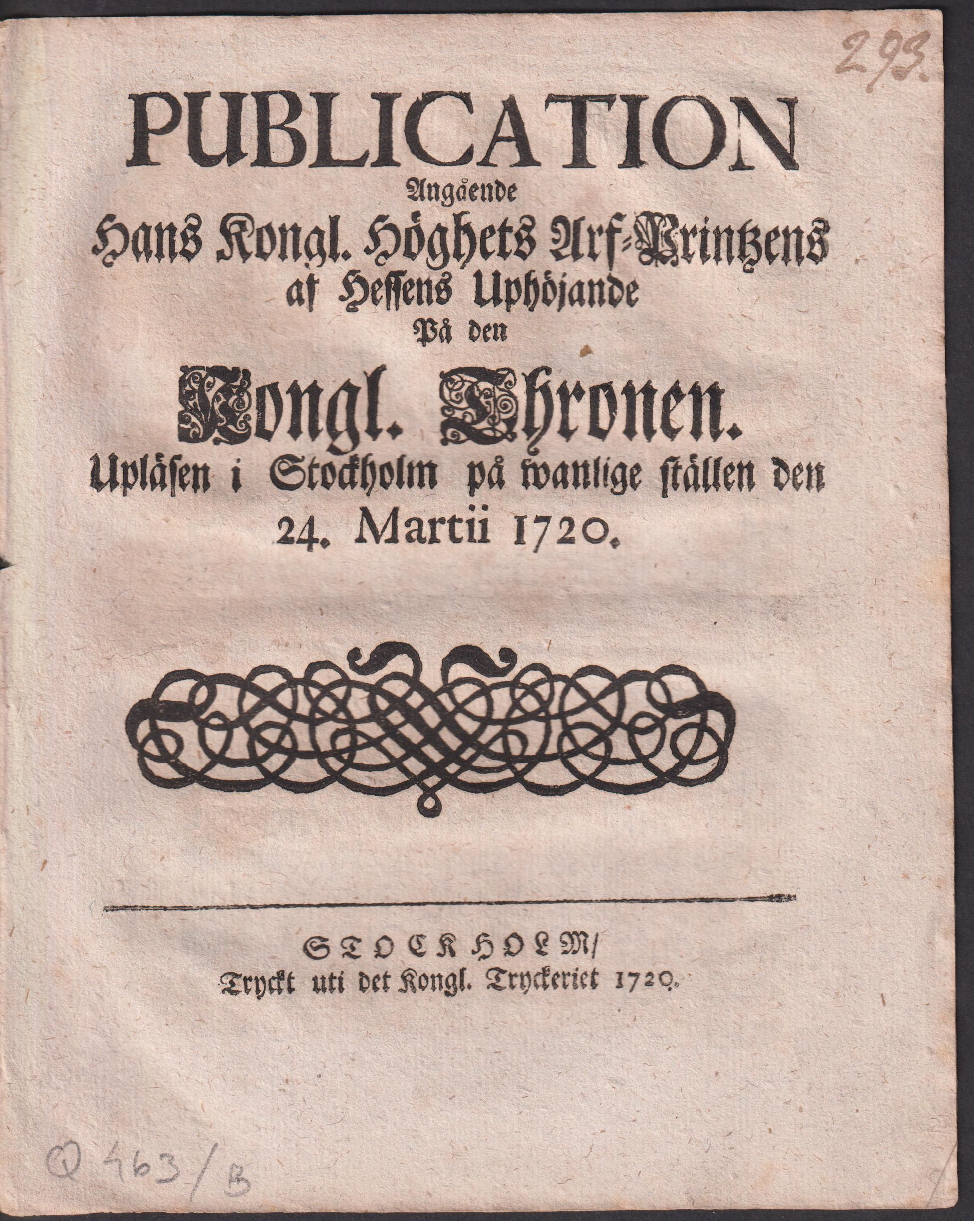 Publication angående hans kongl. höghets arf-printzens af Hessens uphöjande på den kongl. thronen. Upläsen i Stockholm på wanlige ställen den 24. martii 1720.