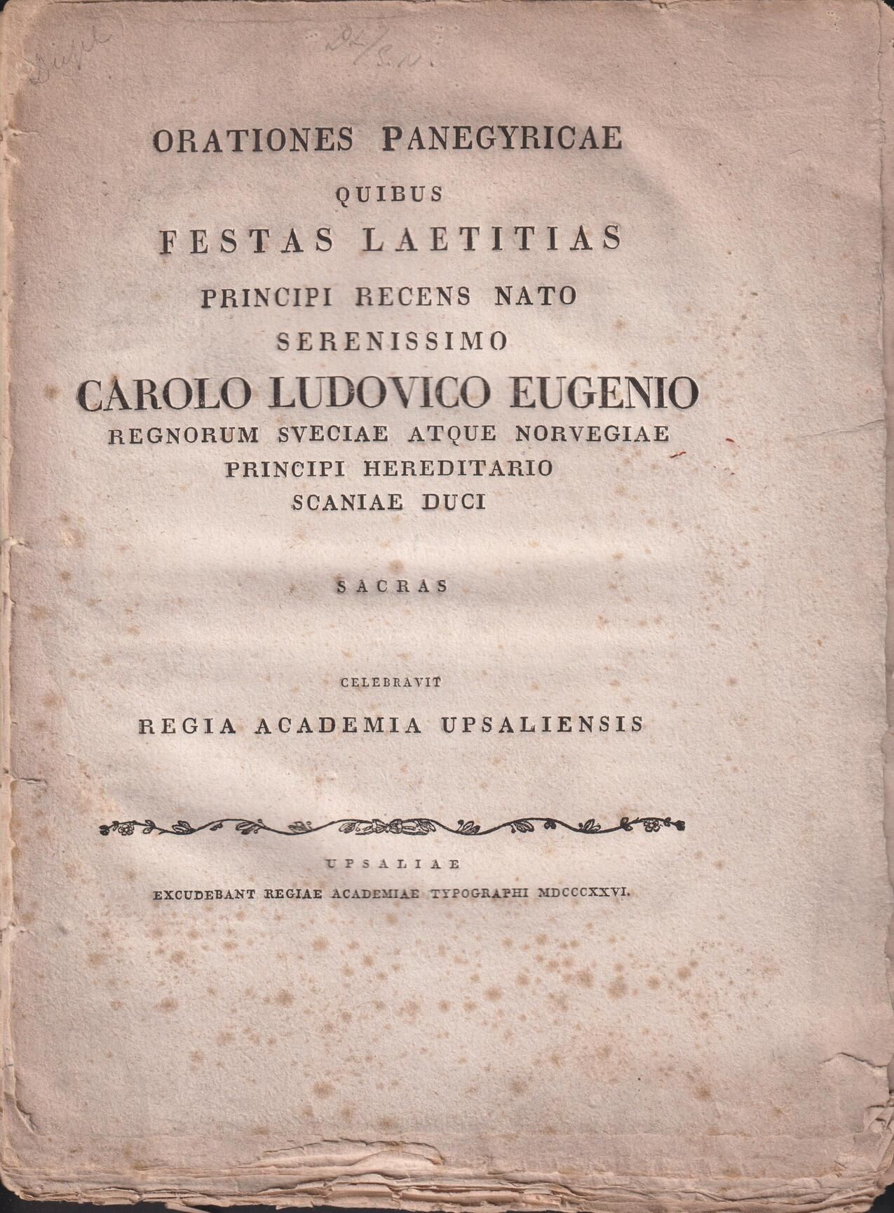 Orationes panegyricae quibus festas laetitias principi recens nato serenissimo Carolo Ludovici Eugenio regnorum Sveciae atque Norvegiae principi hereditario Scaniae duci sacras celebravit regia academia Upsaliensis.