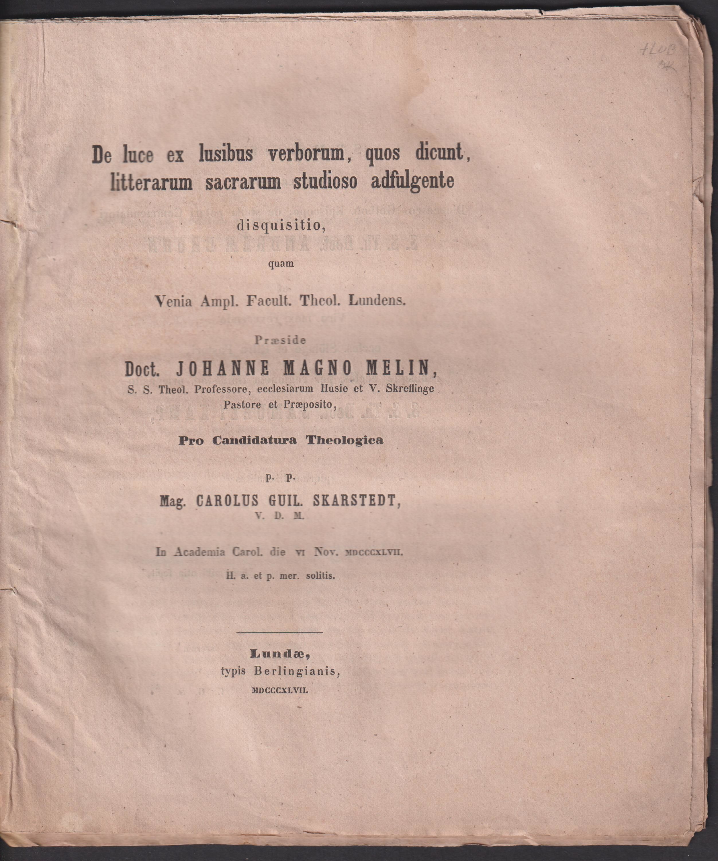 De luce ex lusibus verborum, quos dicunt, litterarum sacrarum studioso adfulgente disquisitio, quam ... præside doct. Johanne Magno Melin ... pro candidatura theologica p.p. mag, Carolus Guil. Skarstedt. v.d.m. In academia Carol. die Vi nov. MDCCCXLVII. H. a et p. mer. solitis.