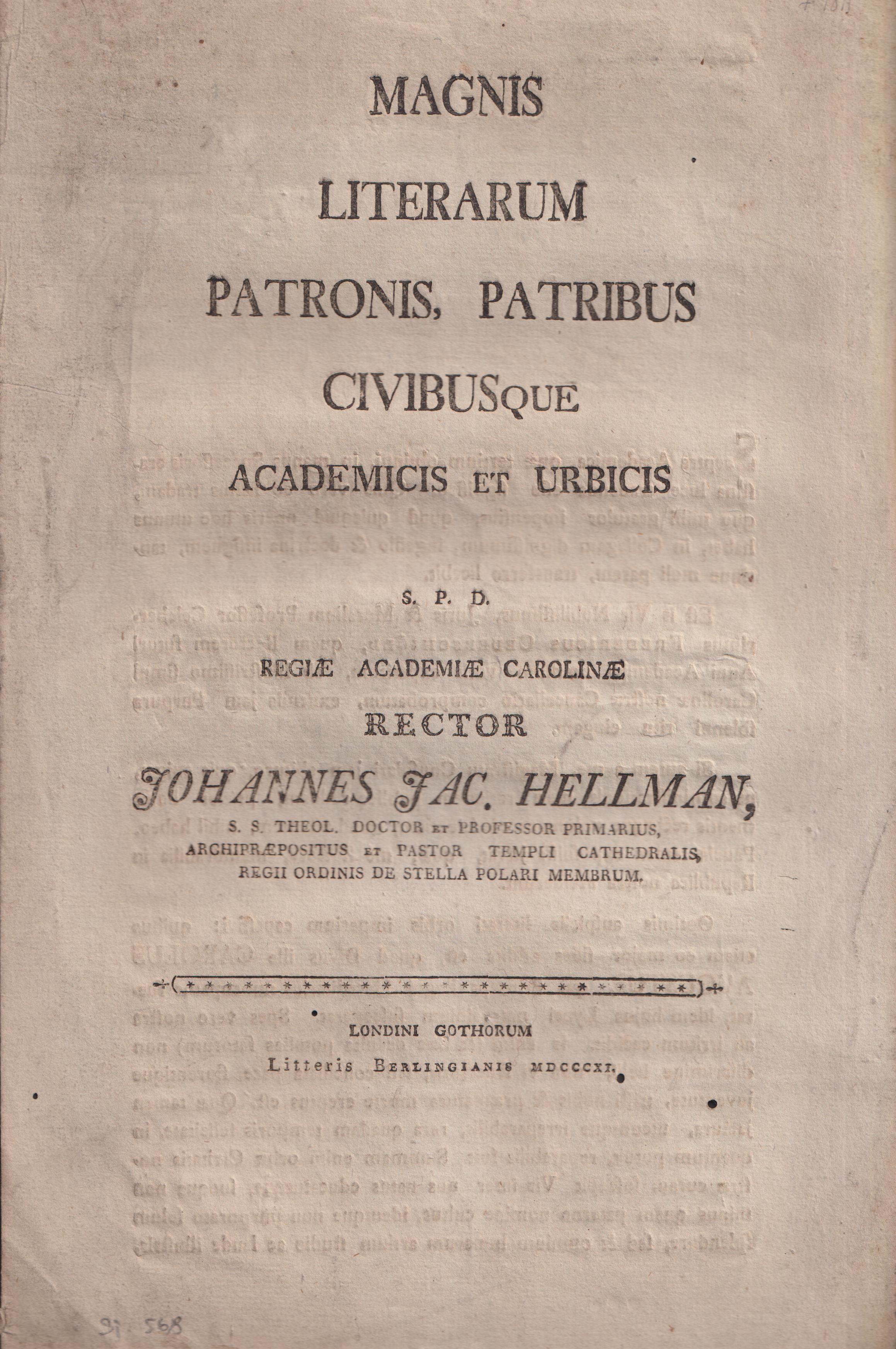 Magnis literarum patronis, patribus civibusque academicis et urbicis s. p. d. regiæ Academiæ Carolinæ rector Johannes Jac. Hellman ...