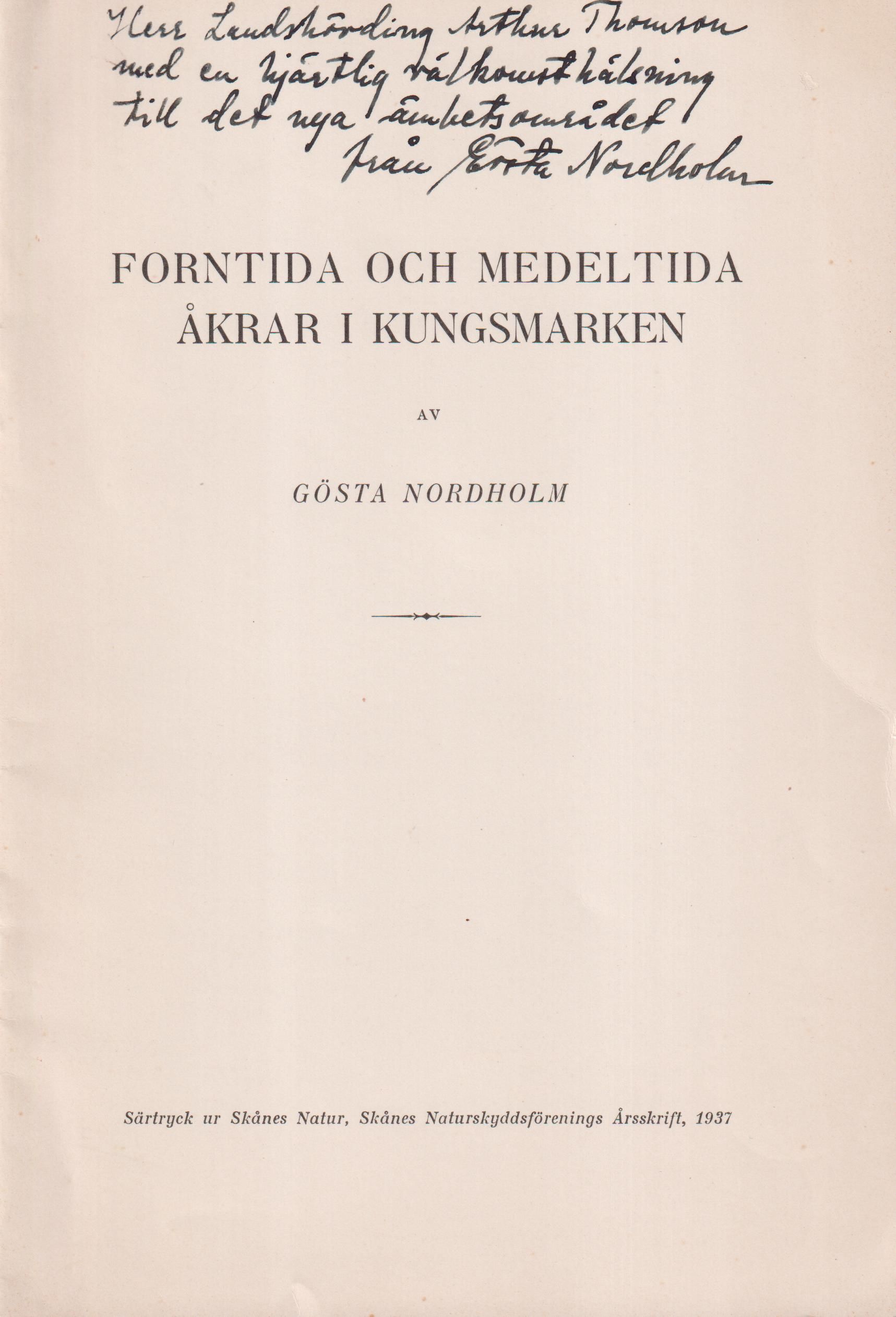 Lund, Berlingska Boktr., 1937. 8:o. s. [84]-103. Illustrerad. Klammerhäftad med styvt tryckt ljusblått pappersomslag. Tillskrift ‘Herr Landshövding Arthur Thomson / med en hjärtlig välkomsthälsning / till det nya ämbetsområdet / från Gösta Nordholm’ på främre omslag.