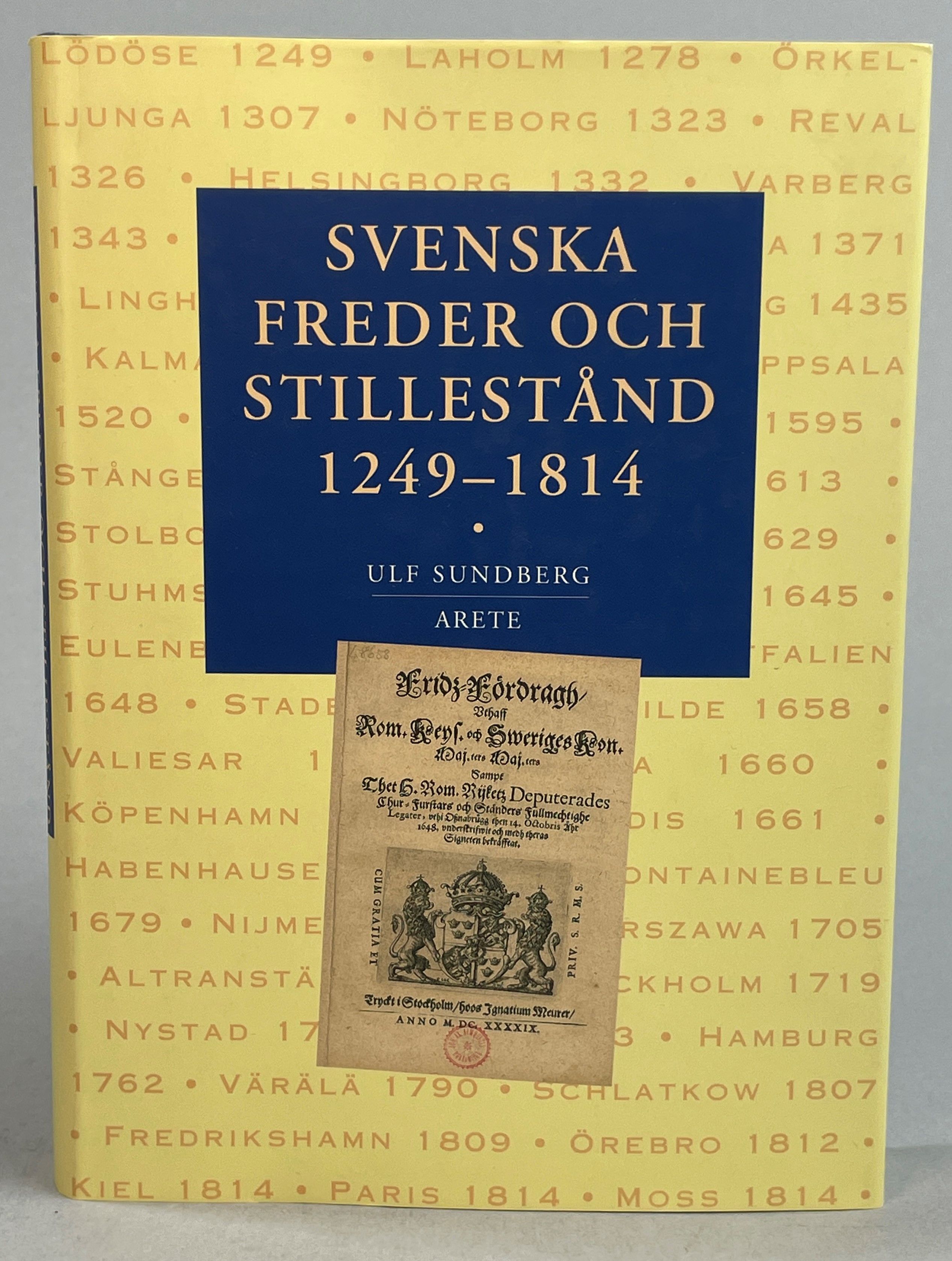 Första upplagan, första tryckningen. Innehåll: Förord; Erik XI Eriksson 'Läspe och halte' 1222-1250 (Freden i Lödöse 1249); Valdemar Birgersson 1250-1275 (Freden vid Gullbergshed 1253); Magnus Birgersson 'Ladulås' 1275-1290 (Freden i Laholm 1278; Gotländska freden 1288); Birger Magnusson 1290-1318 (Uppgörelsen på Kolsäter 1305; Stilleståndet i Bogesund 1307; Örkelljungatraktaten 1307; Dagtingan i Nyköping 1308; Bergatraktaten 1308; Stilleståndet i Nyköping 1309; Stilleståndet i Stensjö 1310; Freden i Oslo 1310; Freden i Helsingborg 1310; Fördraget i Visby 1313; Stilleståndet vid Karleby Långa 1318); Mats Kettilmundsson 1318-1319 (Stilleståndet i Roskilde 1318); Magnus III Eriksson 1319-1364 (Freden i Nöteborg 1323; Freden i Reval 1326; Överenskommelsen i Helsingborg 1332; Andra ryska freden 1339; Freden i Helsingborg 1343; Freden i Varberg 1343; Stilleståndet i Dorpat 1351; Lödöse stillestånd 1357; Skiljedomen i Jönköping 1357; Novemberuppgörelsen 1357; Eriks sista förlikning 1359; Skiljedomen i Helsingborg 1360; Visby kapitulation 1361; Vapenvilan vid Helsingborg 1362); Albrekt av Mecklenburg 1364-1389 (Stilleståndet i Jönköping 1364; Ålholmstraktaten 1366; Stilleståndet i Lödöse 1370; Stilleståndet i Sollentuna 1371; Freden utanför Stockholm 1371; Stilleståndet i Skeninge 1381); Margareta I 1389-1396 (Lindholmstraktaten 1395); Erik XIII av Pommern 1396-1439 (Mötet i Köpenhamn 1398; Vitaliefreden 1398; Bossonöverenskommelsen 1398; Stillestånden i Slite och Visby 1404, Stilleståndet i Kolding 1411; Fredsmötet i Nyborg 1413; Freden i Lolland 1416; Slesvigska stilleståndet 1417; Stilleståndet i Flensburg 1420; Förhandlingen i Flensburg 1426; De hanseatiska separatfrederna 1430; Mötet i Horsens 1432; Mötet i Vordingborg 1434; Freden i Vordingborg 1435; Stilleståndet i Stockholm 1434; Skånska separatfreden 1434; Dagtingan på Helgeandsholmen 1434; Halmstadsrecessen 1435; Freden i Stockholm 1435; Mötet i Vadstena 1436; Mötet i Kalmar 1436); Christoffer av Bayern 1441-1448 (Stilleståndet i Västergarn 1446); Karl VIII Knutsson Bonde 1448-1457 (Uppgörelsen på Gotland 1448; Stilleståndet vid Garne 1449; Stilleståndet i Visby 1449; Stilleståndet vid Oslo 1450; Mötet i Halmstad 1450; Mötet i Avaskär 1451; Stilleståndet i Vadstena 1453; Mötet i Stockholm 1457); Christian I 1457-1464 (Mötet i Stockholm 1458); Karl VIII Knutsson Bonde 1464-1465 (Stilleståndet i Upsala 1464; Freden i Stockholm 1465); Riksföreståndareperioden 1465-1467; Karl VIII Knutsson Bonde 1467-1470 (Mötet i Halmstad 1468; Mötet i Lybeck 1469); Sten Sture den äldre 1470-1497 (Mötet i Kungsäter 1471; Mötet i Stockholm 1471; Stockholmsförhandlingarna 1471; Freden i Kalmar 1472; Kapitulationen Livland 1478; Freden i Reval 1488; Freden i Novgorod 1497; Dagtingan i Stockholm 1497); Hans 1497-1501; Sten Sture den äldre 1501-1503 (Stockholms dagtingan 1502); Svante Nilsson Sture 1504-1512 (Stilleståndet i Köpenhamn 1504; Kalmardomen 1505; Stilleståndet i Köpenhamn 1508; Mötet i Varberg 1508; Mötet i Helsingborg 1509; Mötet i Köpenhamn 1509; 60-årsfreden med Ryssland 1510); Sten Sture den yngre 1512-1520 (Mötet i Malmö 1512; Mötet i Köpenhamn 1513; Andra mötet i Köpenhamn 1515; Stilleståndet i Stockholm 1518; Uppsala dagtingan 1520; Stockholms kapitulation 1520); Christian II 1520-1521; Gustav Vasa 1521-1560 (Stockholms dagtingan 1523; von Mehlens gotlandsstillestånd 1524; Malmö recess 1524; Mötet i Varberg 1530; Stilleståndet i Köpenhamn 1537; Freden i Novgorod 1557); Erik XIV 1560-1568; Johan III 1569-1592 (Mötet i Roskilde 1568; Freden i Stettin 1570; Stilleståndet i Pliusa 1583; Stilleståndet i Pliusa 1585; Stilleståndet i Narva 1590); Sigismund 1592-1598 (Freden i Teusina 1595; Stilleståndet vid Stångebro 1598); Karl IX 1599-1611 (De la Gardies dagtingan 1610); Gustav II Adolf 1611-1632 (Freden i Knäred 1613; Freden i Stolbova 1617; Stilleståndet i Altmark 1629); Kristina 1632-1654 (Stilleståndet i Stuhmsdorf 1635; Stilleståndet i Stockholm 1641; Freden i Brömsebro 1645; Stilleståndet i Eulenburg 1646; Stilleståndet i Ulm 1647; Westfaliska freden 1648); Karl X Gustav 1654-1660 (Recessen i Stade 1654; Freden i Roskilde 1658; Stilleståndet i Valiesar 1658); Kari XI 1660-1697 (Freden i Oliva 1660; Freden i Köpenhamn 1660; Freden i Kardis 1661; Traktaten i Habenhausen 1666; Första freden i Nijmegen 1679; Freden i Celle 1679; Andra freden i Nijmegen 1679; Freden i S:t Germain 1679; Freden i Fontainebleau 1679; Tredje freden i Nijmegen 1679); Karl XII 1697-1718 (Freden i Traventhal 1700; Freden i Warszawa 1705; Freden i Altranstädt); Ulrika Eleonora 1718-1720 (Freden i Stockholm 1719; Freden i Stockholm 1720; Freden i Stockholm 1720); Fredrik I 1720-1751 (Freden i Nystad 1721; Deklarationerna ang fred med Sachsen 1729; Deklarationerna ang fred med Polen 1732; Freden i Åbo 1743); Adolf Fredrik 1751-1771 (Freden i Hamburg 1762); Gustav III 1771-1792 (De danska neutralitetsdeklarationen 1789; Freden i Värälä 1790); Gustav IV Adolf 1792-1809 (Stilleståndet i Schlatkow 1807; Uppgörelsen på Rügen 1807); Karl XIII 1809-1818 (Freden i Fredrikshamn 1809; Freden i Jönköping 1809; Freden i Paris 1810; Freden i Örebro 1812; Freden i Kiel 1814; Freden i Paris 1814; Konventionen i Moss 1814); Bilaga 1. Freder och stillestånd ordnade efter nation; Bilaga 2. Freden med San Marino; Litteraturförteckning; Personregister omfattande tiden fram till Gustav Vasa; Orts- och platsregister omfattande tiden fram till Gustav Vasa; Personregister omfattande tiden från och med Gustav Vasa; Orts- och platsregister omfattande tiden från och med Gustav Vasa; kartförteckning.