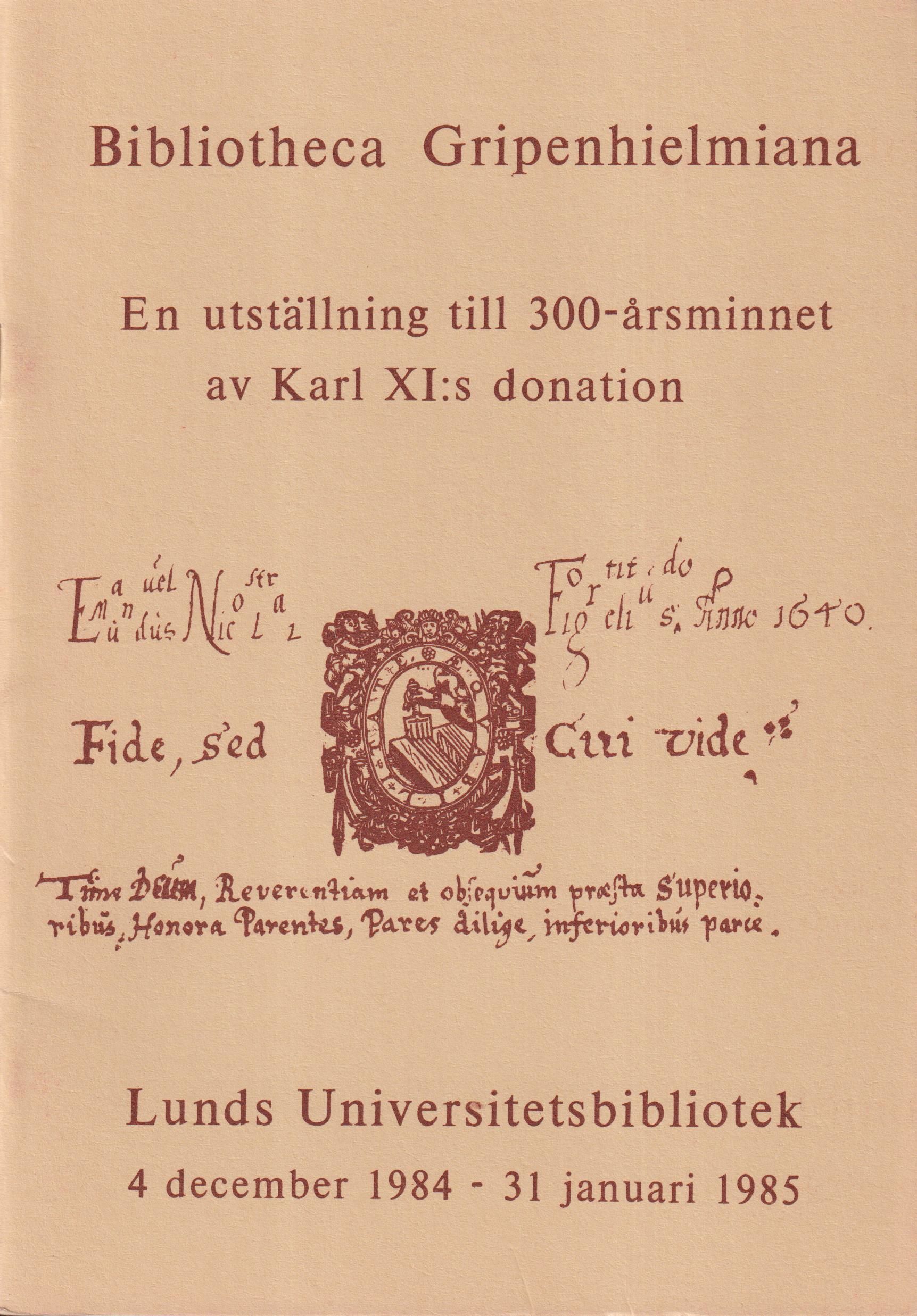 Bibliotheca Gripenhielmiana. En utställning till 300-årsminnet av Karl XI:s donation. [Lunds universitetsbibliotek 4 december 1984-31 januari 1985].