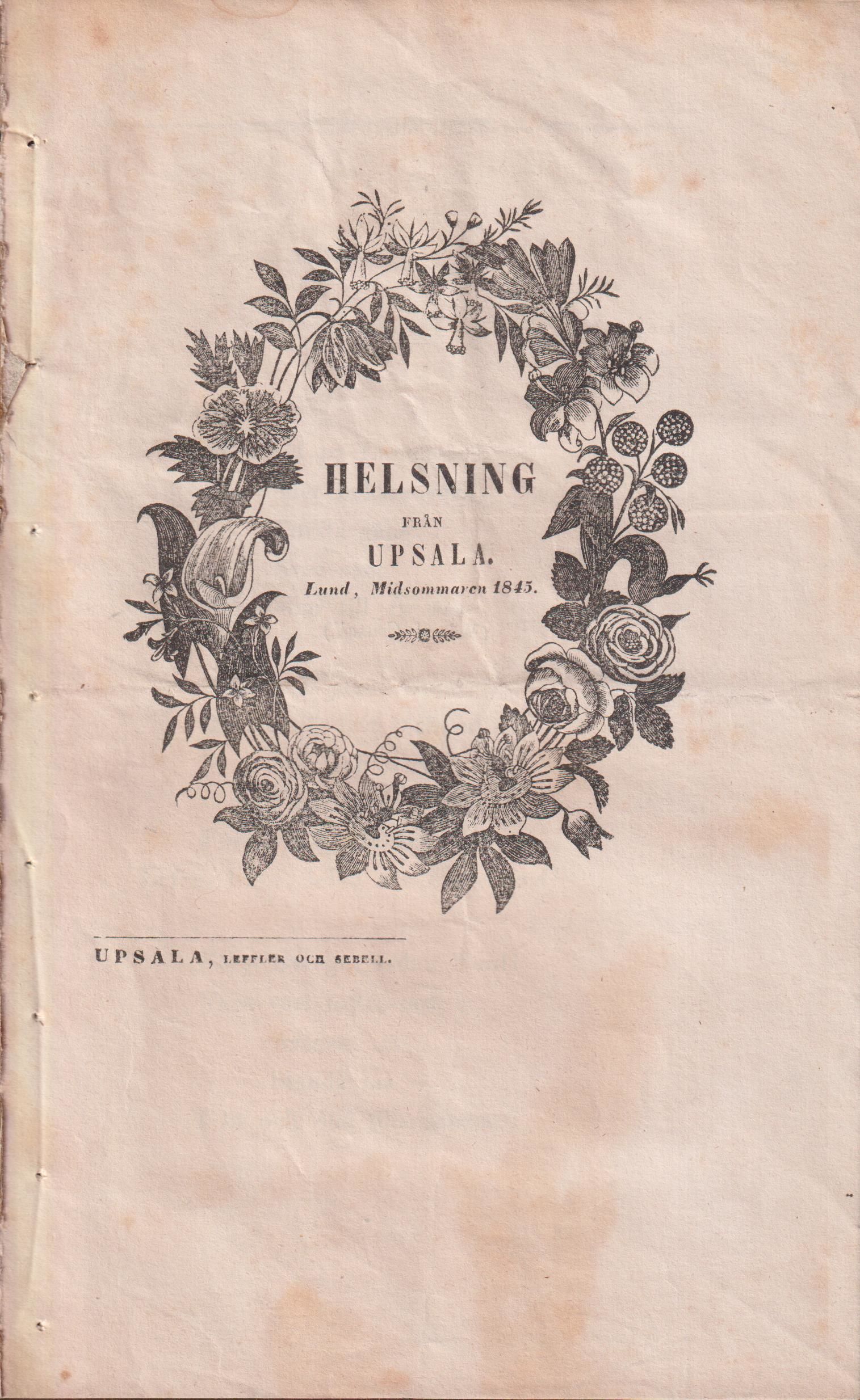 Upsala, Leffler och Sebell, 1845. 8:o. (4) s. Tagen ur band, vikt ark. Tvärgående vikmärke. Något fläckig.