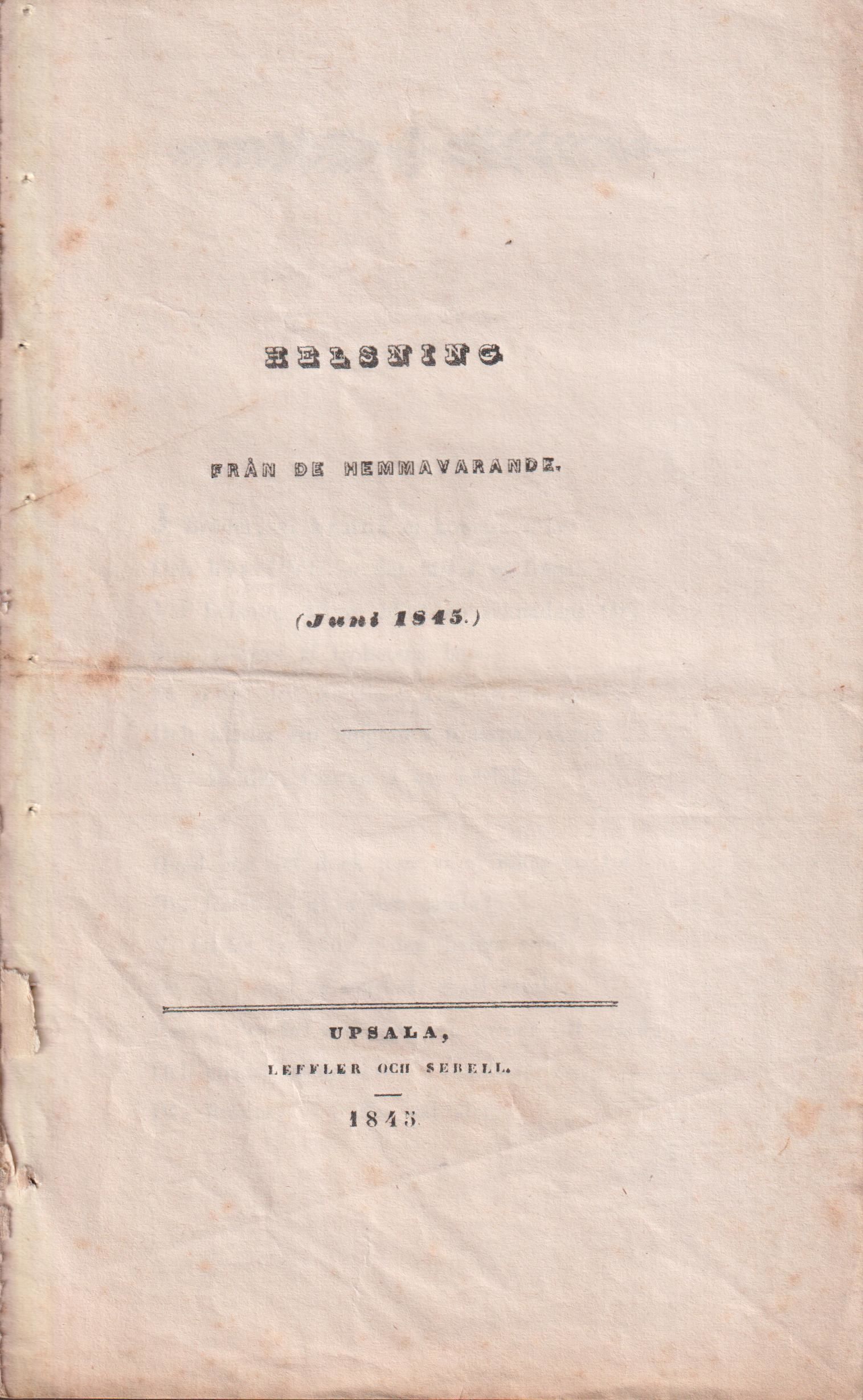 Upsala, Leffler och Sebell, 1845. 8:o. (4) s. Tagen ur band, vikt ark. Tvär och längsgående vikmärken. Något fläckad.