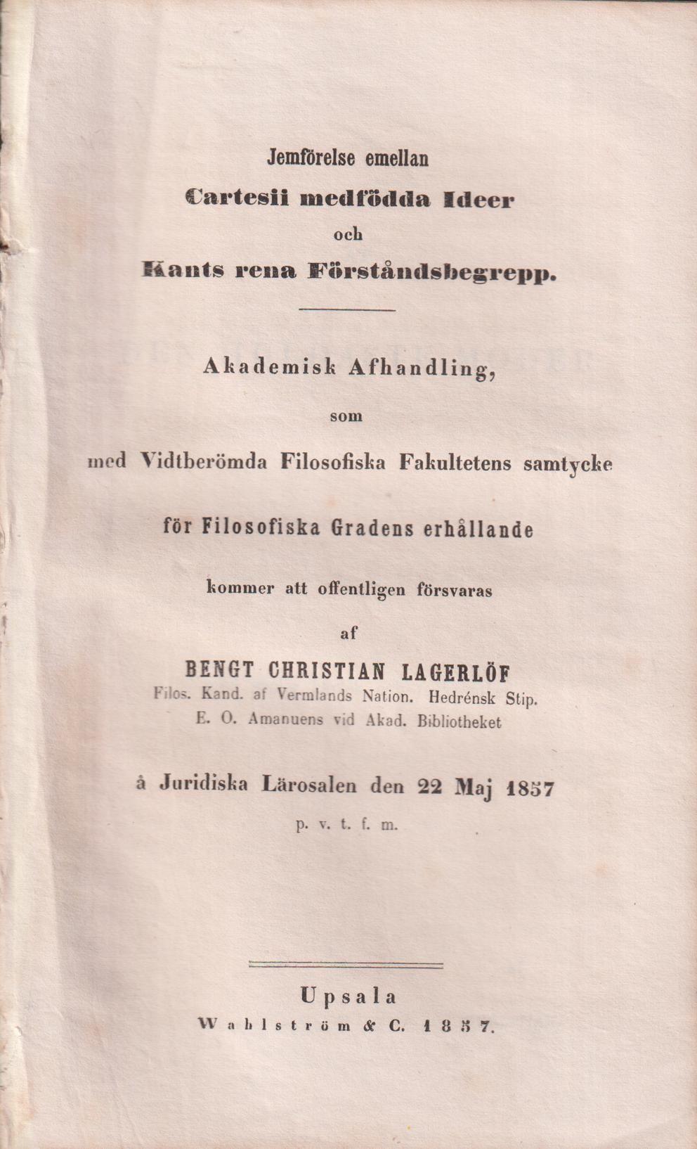 Jemförelse emllan Cartesii medfödda ideer och Kants rena förståndsbegrepp. Akademisk afhandling, som ... för filosofiska gradens erhållande kommer att offentligen försvaras af Bengt Christian Lagerlöf ... å juridiska lärosalen den 22 maj 1857, p.v.t.f.m.