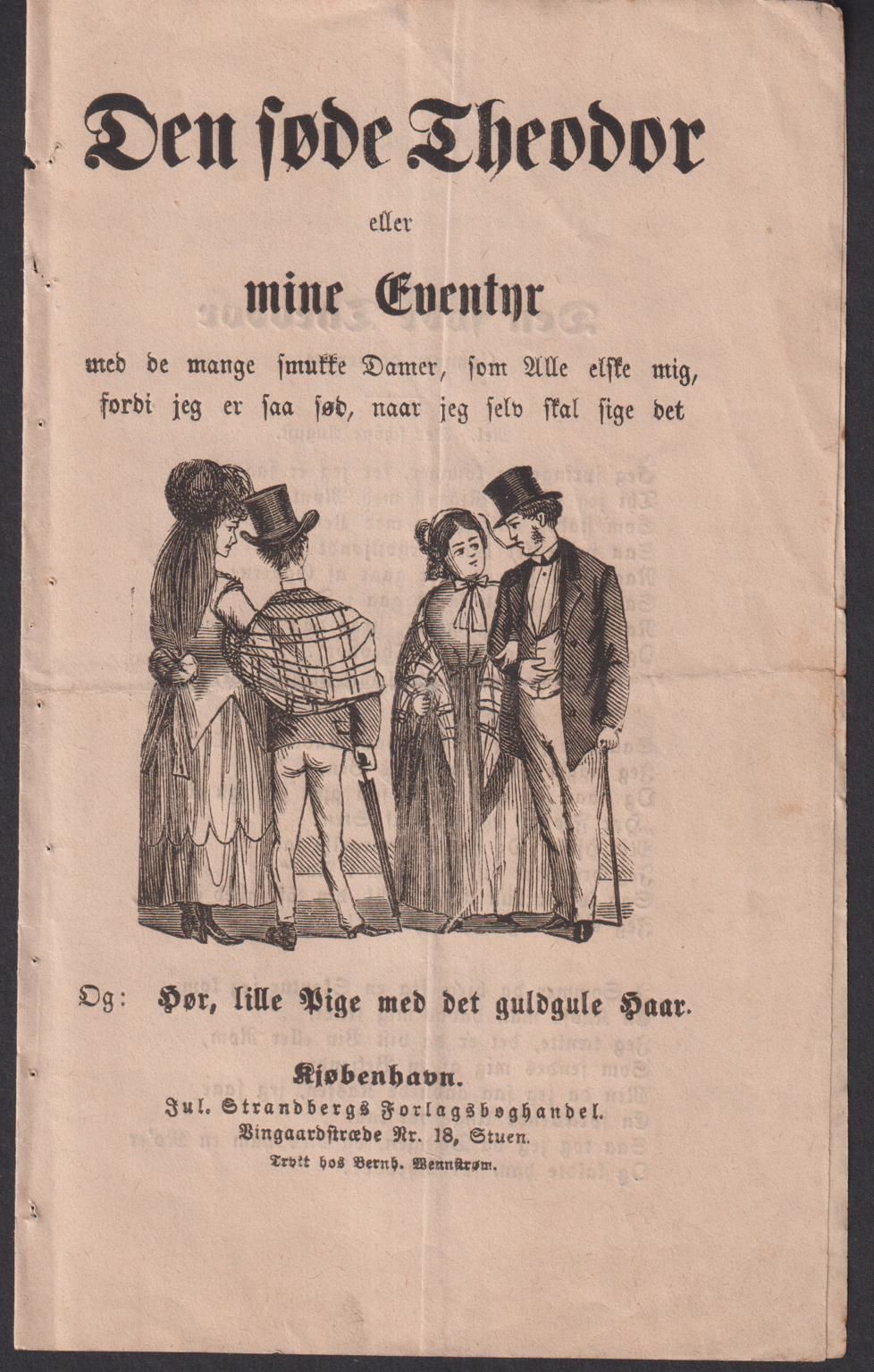 Kjøbenhavn, Jul. Strandbergs Forlagsboghandel, s.a. 8:o. (4) s. Titelbladet med vinjett. Vikt blad. Tagen ur band. Längs- & tvärgående vikmärke.