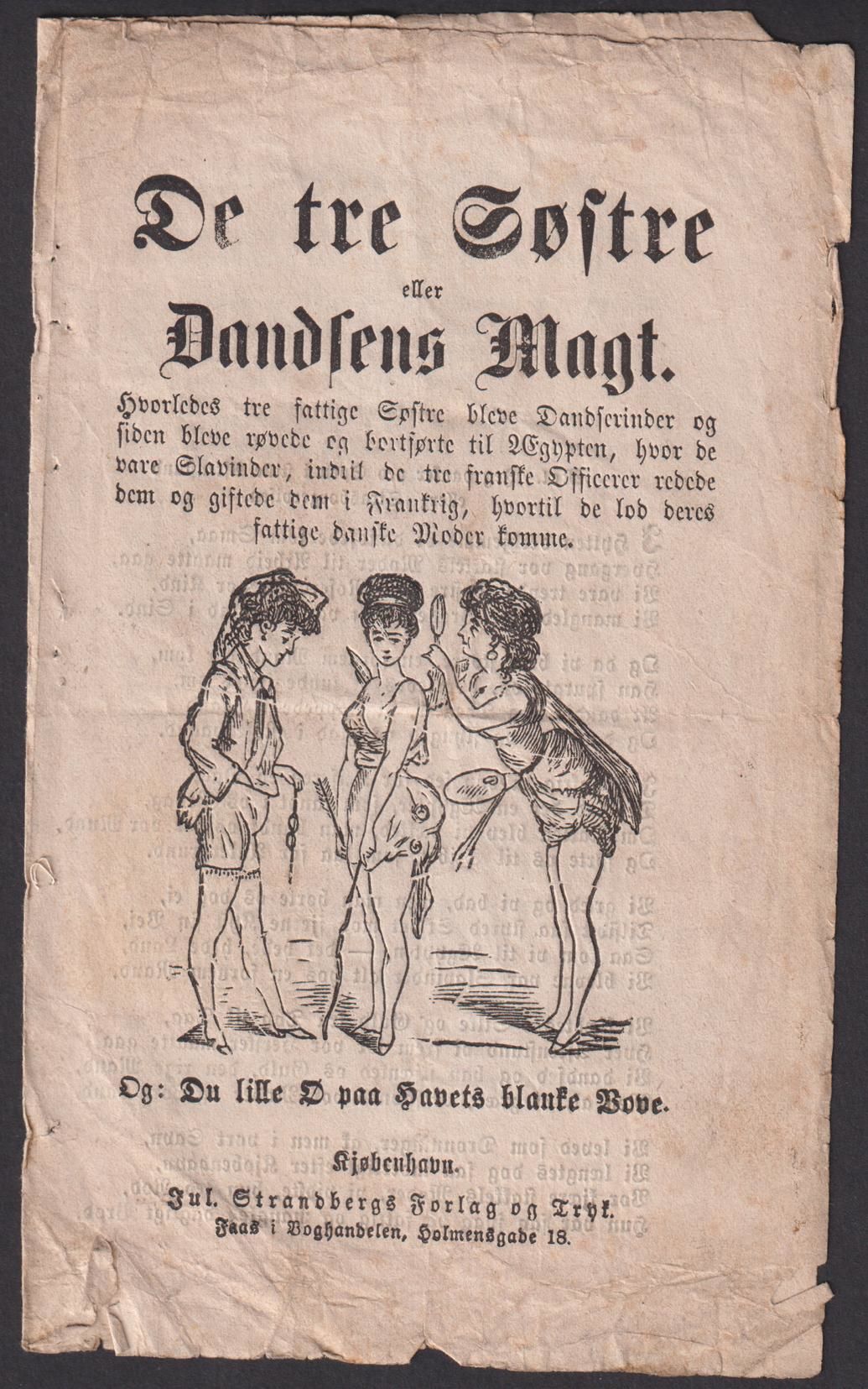De tre søsøstre eller dandsens magt. Hvorledes tre fattige søstre bleve dandserinder og siden bleve røvede og bortførte til Ægypten, hvor de vare slavinder, indtil de tre franske officerer redede dem og giftede dem i Frankrig, hvortil de lod deres fattige danske moder komme. Og du lille ø paa havets blanke hove.