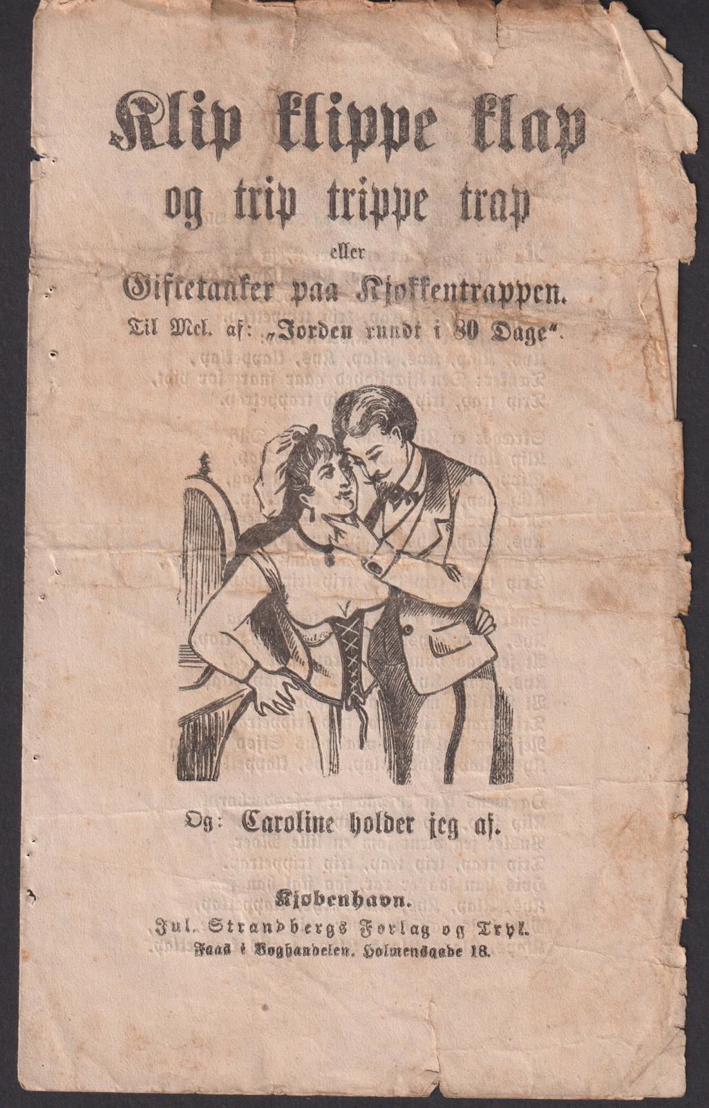 Kjøbenhavn, Jul. Strandbergs Forlag og tryk, s.a. 8:o. (4) s. Titelbladet med träsnittsvinjett. Vikt blad. Tagen ur band. Nött och smutsig. Yttre marginaler med nagg och revor.