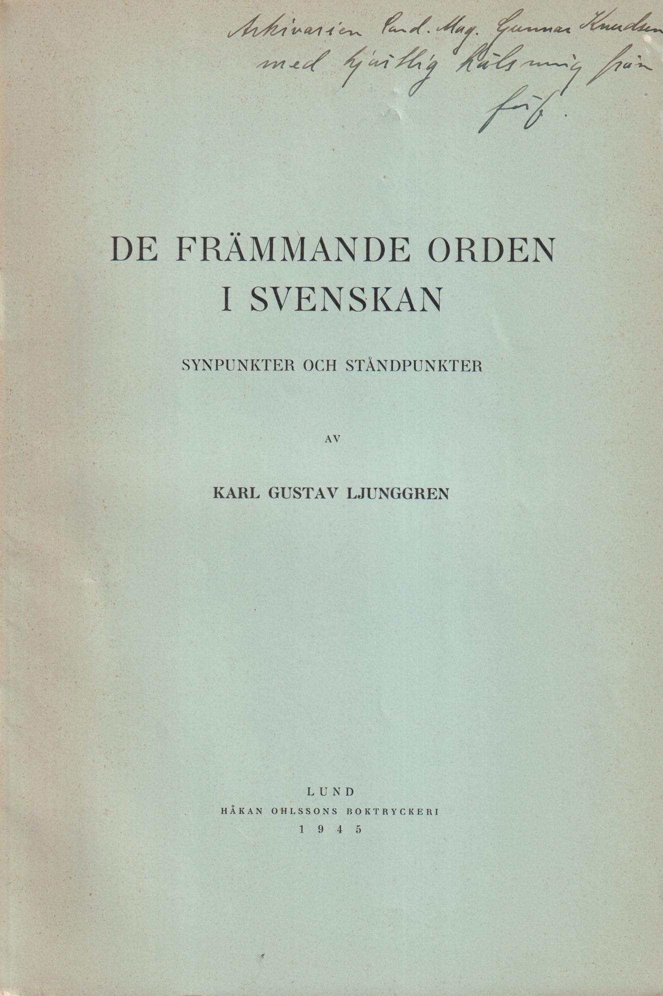 Lund, Håkan Ohlssons Boktryckeri, 1945. 8:o. 21 s. Klammerhäftad med tryckt pappersomslag. Främre omslag med två minimala hål vid övre yttre hörn. Tillskrift 'Arkivarien Cand. Mag. Gunnar Knudsen / med hjärtlig hälsning från förf.' på främre omslag.