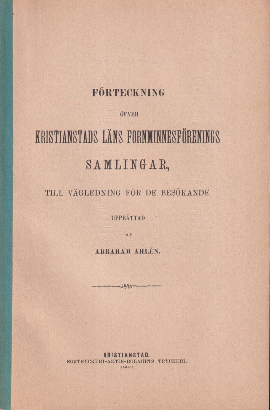 Förteckning öfver Kristianstads läns fornminnesförenings samlingar, till vägledning för de besökande upprättad af Abraha Ahlén.