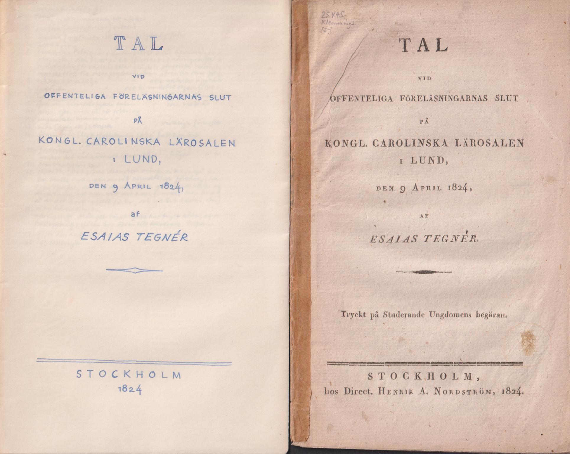 Tal vid offenteliga föreläsningarnas slut på kongl. carolinska lärosalen i Lund, den 9 april 1824, af Esaias Tegnér. Tryckt på studerande ungdomens begäran.
