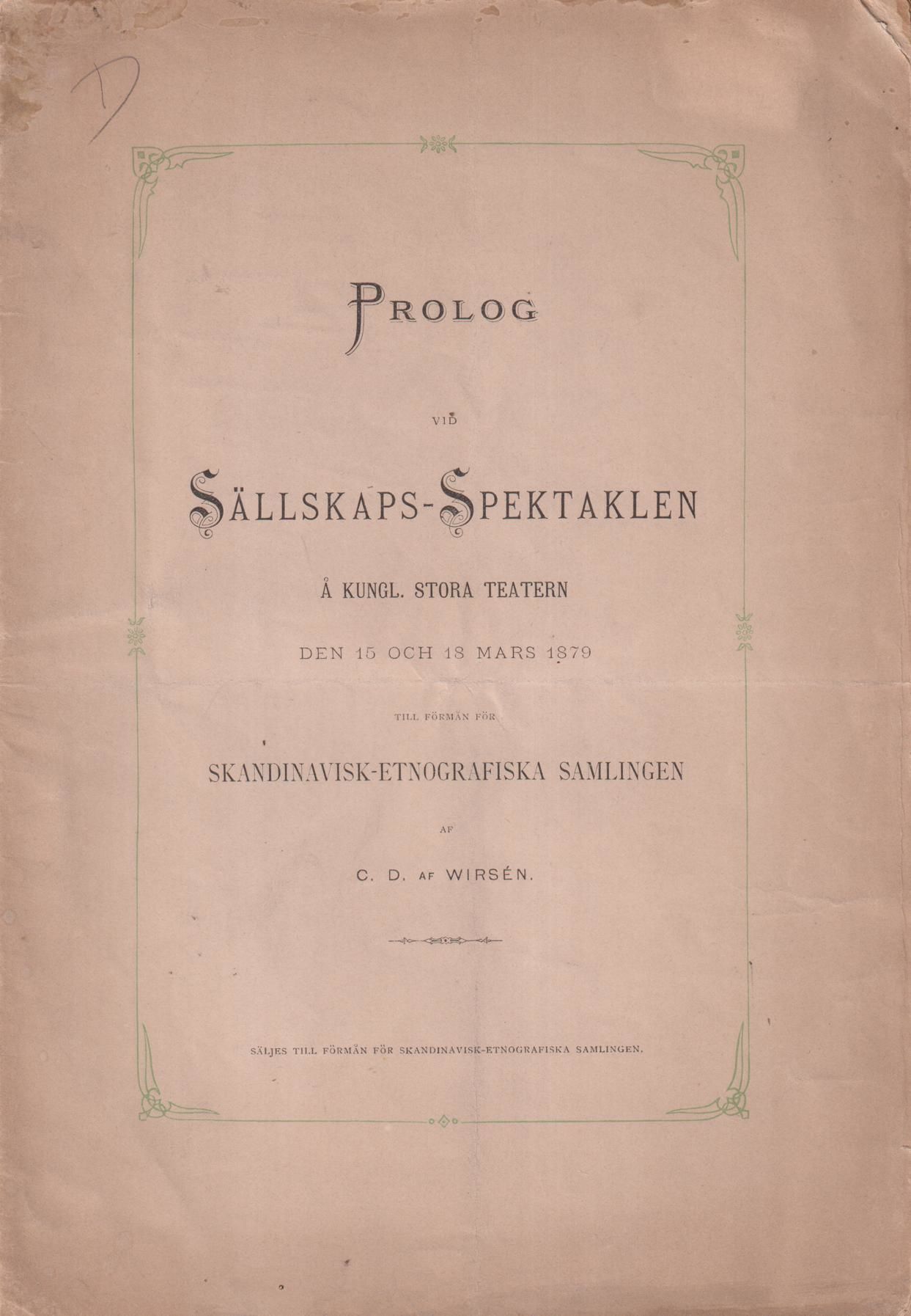 Prolog vid Sällskaps-Spektaklen, å Kungl. Stora Teatern, den 15 och 18 mars 1879, till förmån för Skandinavisk-Etnografiska samlingen af C. D. Wirsén.