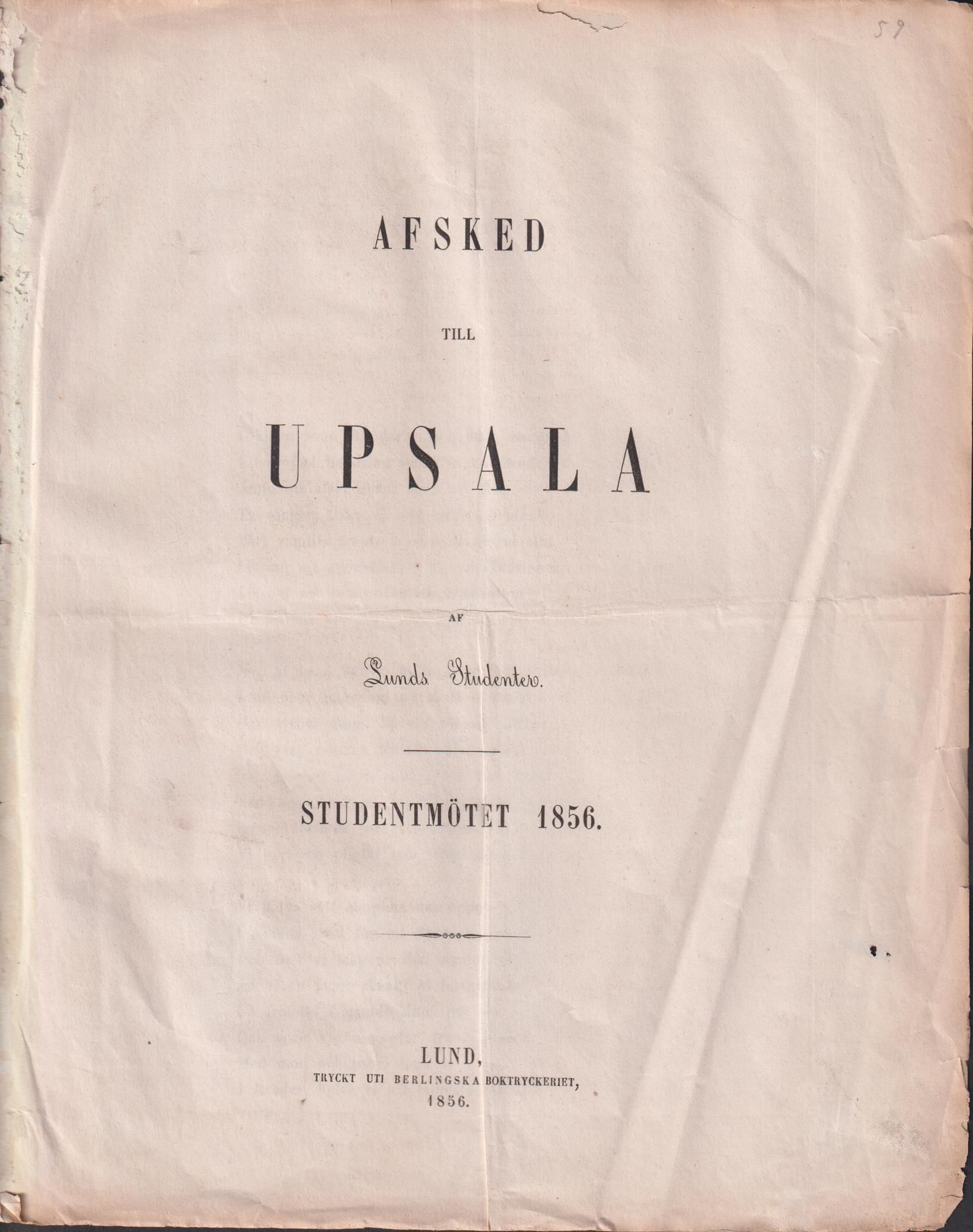 Lund, tryckt uti Berlingska Boktryckeriet, 1856. 4:o. (4) s. Tagen ur band. Tvär- & längsgående vikmärke. Yttre marginaler med riss och nagg samt mindre hål och pappersförluster efter skadedjurs framfart.