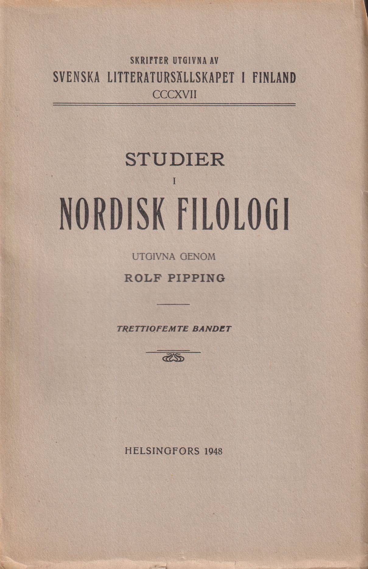 Skrifter utgivna av Svenska litteratursällskapet i Finland 317. Innehåll: Två östnordiska medeltidsordspråk om sillföda, av Arnold Nordling; Arnold Nordling, av Rolf Pipping; Anteckningar till Västgötalagen, av Rolf Pipping; 'Inte bry sig om', av Rolf Pipping; Namn på kullar och backar i Sibbå socken, av V.E.V. Wessman; Två österbottniska ortnamn, av Carl-Eric Thors.
