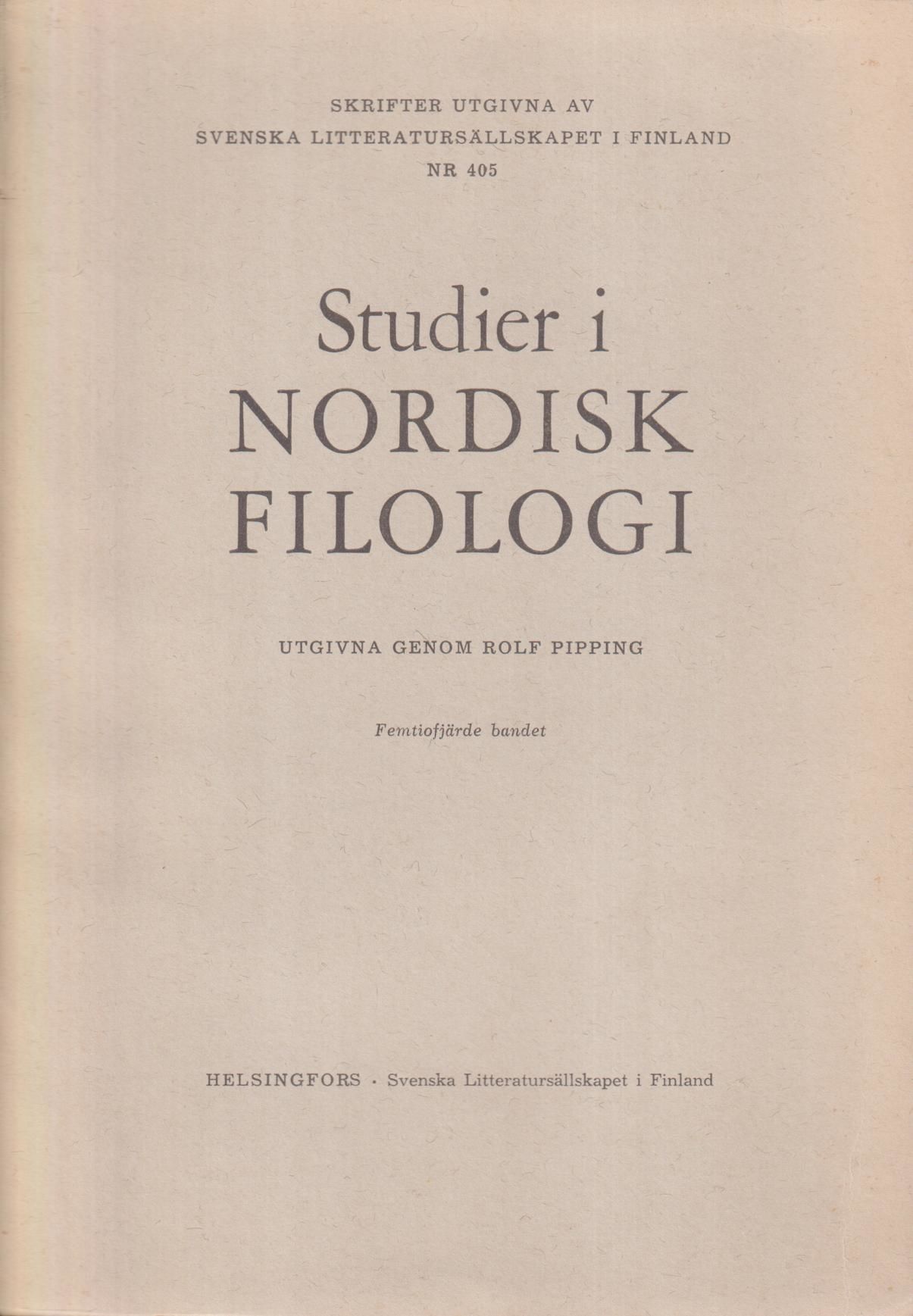 Skrifter utgivna av Svenska litteratursällskapet i Finland 405. Studier i nordisk filologi, utgivna genom Rolf Pipping. Femtiofjärde bandet.